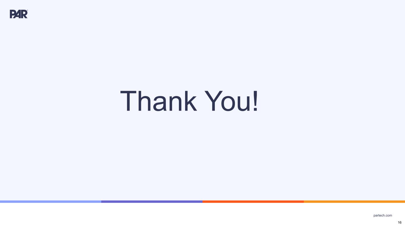 partech.com • Annual Recurring Revenue or "ARR” is the annualized revenue from subscription services, including subscription fees for our SaaS solutions and related software support, managed platform development services, and transaction-based payment processing services. We generally calculate ARR by annualizing the monthly subscription service revenue for all Active Sites as of the last day of each month for the respective reporting period. • “Active Sites” represent locations active on PAR’s subscription services as of the last day of the respective fiscal period. • “Adjusted Subscription Gross Margin” is a non-GAAP financial measure for PAR’s gross margin of subscription service revenue excluding amortization of acquired and internally developed technology. • “Churn” reflects the negative change in Active Site count of PAR customers, for a specific period. Key Performance Indicators 15