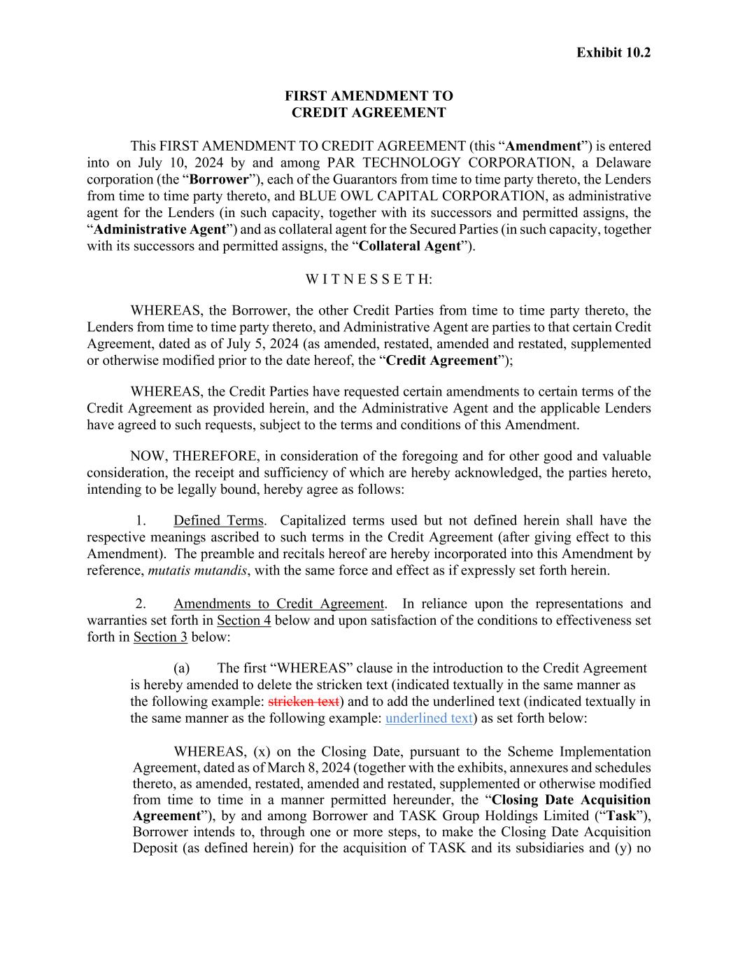 Exhibit 10.2 FIRST AMENDMENT TO CREDIT AGREEMENT This FIRST AMENDMENT TO CREDIT AGREEMENT (this “Amendment”) is entered into on July 10, 2024 by and among PAR TECHNOLOGY CORPORATION, a Delaware corporation (the “Borrower”), each of the Guarantors from time to time party thereto, the Lenders from time to time party thereto, and BLUE OWL CAPITAL CORPORATION, as administrative agent for the Lenders (in such capacity, together with its successors and permitted assigns, the “Administrative Agent”) and as collateral agent for the Secured Parties (in such capacity, together with its successors and permitted assigns, the “Collateral Agent”). W I T N E S S E T H: WHEREAS, the Borrower, the other Credit Parties from time to time party thereto, the Lenders from time to time party thereto, and Administrative Agent are parties to that certain Credit Agreement, dated as of July 5, 2024 (as amended, restated, amended and restated, supplemented or otherwise modified prior to the date hereof, the “Credit Agreement”); WHEREAS, the Credit Parties have requested certain amendments to certain terms of the Credit Agreement as provided herein, and the Administrative Agent and the applicable Lenders have agreed to such requests, subject to the terms and conditions of this Amendment. NOW, THEREFORE, in consideration of the foregoing and for other good and valuable consideration, the receipt and sufficiency of which are hereby acknowledged, the parties hereto, intending to be legally bound, hereby agree as follows: 1. Defined Terms. Capitalized terms used but not defined herein shall have the respective meanings ascribed to such terms in the Credit Agreement (after giving effect to this Amendment). The preamble and recitals hereof are hereby incorporated into this Amendment by reference, mutatis mutandis, with the same force and effect as if expressly set forth herein. 2. Amendments to Credit Agreement. In reliance upon the representations and warranties set forth in Section 4 below and upon satisfaction of the conditions to effectiveness set forth in Section 3 below: (a) The first “WHEREAS” clause in the introduction to the Credit Agreement is hereby amended to delete the stricken text (indicated textually in the same manner as the following example: stricken text) and to add the underlined text (indicated textually in the same manner as the following example: underlined text) as set forth below: WHEREAS, (x) on the Closing Date, pursuant to the Scheme Implementation Agreement, dated as of March 8, 2024 (together with the exhibits, annexures and schedules thereto, as amended, restated, amended and restated, supplemented or otherwise modified from time to time in a manner permitted hereunder, the “Closing Date Acquisition Agreement”), by and among Borrower and TASK Group Holdings Limited (“Task”), Borrower intends to, through one or more steps, to make the Closing Date Acquisition Deposit (as defined herein) for the acquisition of TASK and its subsidiaries and (y) no