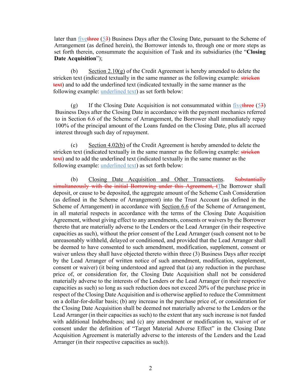 2 later than fivethree (53) Business Days after the Closing Date, pursuant to the Scheme of Arrangement (as defined herein), the Borrower intends to, through one or more steps as set forth therein, consummate the acquisition of Task and its subsidiaries (the “Closing Date Acquisition”); (b) Section 2.10(g) of the Credit Agreement is hereby amended to delete the stricken text (indicated textually in the same manner as the following example: stricken text) and to add the underlined text (indicated textually in the same manner as the following example: underlined text) as set forth below: (g) If the Closing Date Acquisition is not consummated within fivethree (53) Business Days after the Closing Date in accordance with the payment mechanics referred to in Section 6.6 of the Scheme of Arrangement, the Borrower shall immediately repay 100% of the principal amount of the Loans funded on the Closing Date, plus all accrued interest through such day of repayment. (c) Section 4.02(b) of the Credit Agreement is hereby amended to delete the stricken text (indicated textually in the same manner as the following example: stricken text) and to add the underlined text (indicated textually in the same manner as the following example: underlined text) as set forth below: (b) Closing Date Acquisition and Other Transactions. Substantially simultaneously with the initial Borrowing under this Agreement, tThe Borrower shall deposit, or cause to be deposited, the aggregate amount of the Scheme Cash Consideration (as defined in the Scheme of Arrangement) into the Trust Account (as defined in the Scheme of Arrangement) in accordance with Section 6.6 of the Scheme of Arrangement, in all material respects in accordance with the terms of the Closing Date Acquisition Agreement, without giving effect to any amendments, consents or waivers by the Borrower thereto that are materially adverse to the Lenders or the Lead Arranger (in their respective capacities as such), without the prior consent of the Lead Arranger (such consent not to be unreasonably withheld, delayed or conditioned, and provided that the Lead Arranger shall be deemed to have consented to such amendment, modification, supplement, consent or waiver unless they shall have objected thereto within three (3) Business Days after receipt by the Lead Arranger of written notice of such amendment, modification, supplement, consent or waiver) (it being understood and agreed that (a) any reduction in the purchase price of, or consideration for, the Closing Date Acquisition shall not be considered materially adverse to the interests of the Lenders or the Lead Arranger (in their respective capacities as such) so long as such reduction does not exceed 20% of the purchase price in respect of the Closing Date Acquisition and is otherwise applied to reduce the Commitment on a dollar-for-dollar basis; (b) any increase in the purchase price of, or consideration for the Closing Date Acquisition shall be deemed not materially adverse to the Lenders or the Lead Arranger (in their capacities as such) to the extent that any such increase is not funded with additional Indebtedness; and (c) any amendment or modification to, waiver of or consent under the definition of “Target Material Adverse Effect” in the Closing Date Acquisition Agreement is materially adverse to the interests of the Lenders and the Lead Arranger (in their respective capacities as such)).