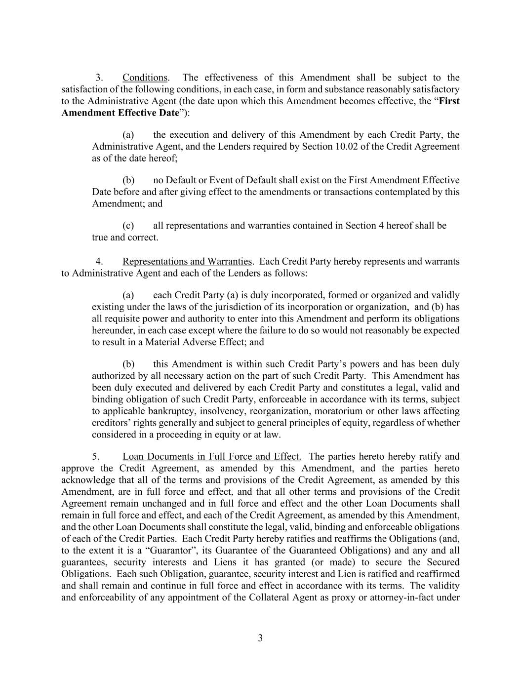 3 3. Conditions. The effectiveness of this Amendment shall be subject to the satisfaction of the following conditions, in each case, in form and substance reasonably satisfactory to the Administrative Agent (the date upon which this Amendment becomes effective, the “First Amendment Effective Date”): (a) the execution and delivery of this Amendment by each Credit Party, the Administrative Agent, and the Lenders required by Section 10.02 of the Credit Agreement as of the date hereof; (b) no Default or Event of Default shall exist on the First Amendment Effective Date before and after giving effect to the amendments or transactions contemplated by this Amendment; and (c) all representations and warranties contained in Section 4 hereof shall be true and correct. 4. Representations and Warranties. Each Credit Party hereby represents and warrants to Administrative Agent and each of the Lenders as follows: (a) each Credit Party (a) is duly incorporated, formed or organized and validly existing under the laws of the jurisdiction of its incorporation or organization, and (b) has all requisite power and authority to enter into this Amendment and perform its obligations hereunder, in each case except where the failure to do so would not reasonably be expected to result in a Material Adverse Effect; and (b) this Amendment is within such Credit Party’s powers and has been duly authorized by all necessary action on the part of such Credit Party. This Amendment has been duly executed and delivered by each Credit Party and constitutes a legal, valid and binding obligation of such Credit Party, enforceable in accordance with its terms, subject to applicable bankruptcy, insolvency, reorganization, moratorium or other laws affecting creditors’ rights generally and subject to general principles of equity, regardless of whether considered in a proceeding in equity or at law. 5. Loan Documents in Full Force and Effect. The parties hereto hereby ratify and approve the Credit Agreement, as amended by this Amendment, and the parties hereto acknowledge that all of the terms and provisions of the Credit Agreement, as amended by this Amendment, are in full force and effect, and that all other terms and provisions of the Credit Agreement remain unchanged and in full force and effect and the other Loan Documents shall remain in full force and effect, and each of the Credit Agreement, as amended by this Amendment, and the other Loan Documents shall constitute the legal, valid, binding and enforceable obligations of each of the Credit Parties. Each Credit Party hereby ratifies and reaffirms the Obligations (and, to the extent it is a “Guarantor”, its Guarantee of the Guaranteed Obligations) and any and all guarantees, security interests and Liens it has granted (or made) to secure the Secured Obligations. Each such Obligation, guarantee, security interest and Lien is ratified and reaffirmed and shall remain and continue in full force and effect in accordance with its terms. The validity and enforceability of any appointment of the Collateral Agent as proxy or attorney-in-fact under