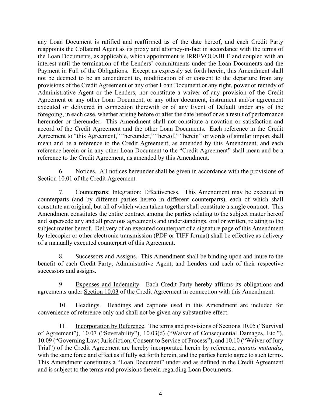 4 any Loan Document is ratified and reaffirmed as of the date hereof, and each Credit Party reappoints the Collateral Agent as its proxy and attorney-in-fact in accordance with the terms of the Loan Documents, as applicable, which appointment is IRREVOCABLE and coupled with an interest until the termination of the Lenders’ commitments under the Loan Documents and the Payment in Full of the Obligations. Except as expressly set forth herein, this Amendment shall not be deemed to be an amendment to, modification of or consent to the departure from any provisions of the Credit Agreement or any other Loan Document or any right, power or remedy of Administrative Agent or the Lenders, nor constitute a waiver of any provision of the Credit Agreement or any other Loan Document, or any other document, instrument and/or agreement executed or delivered in connection therewith or of any Event of Default under any of the foregoing, in each case, whether arising before or after the date hereof or as a result of performance hereunder or thereunder. This Amendment shall not constitute a novation or satisfaction and accord of the Credit Agreement and the other Loan Documents. Each reference in the Credit Agreement to “this Agreement,” “hereunder,” “hereof,” “herein” or words of similar import shall mean and be a reference to the Credit Agreement, as amended by this Amendment, and each reference herein or in any other Loan Document to the “Credit Agreement” shall mean and be a reference to the Credit Agreement, as amended by this Amendment. 6. Notices. All notices hereunder shall be given in accordance with the provisions of Section 10.01 of the Credit Agreement. 7. Counterparts; Integration; Effectiveness. This Amendment may be executed in counterparts (and by different parties hereto in different counterparts), each of which shall constitute an original, but all of which when taken together shall constitute a single contract. This Amendment constitutes the entire contract among the parties relating to the subject matter hereof and supersede any and all previous agreements and understandings, oral or written, relating to the subject matter hereof. Delivery of an executed counterpart of a signature page of this Amendment by telecopier or other electronic transmission (PDF or TIFF format) shall be effective as delivery of a manually executed counterpart of this Agreement. 8. Successors and Assigns. This Amendment shall be binding upon and inure to the benefit of each Credit Party, Administrative Agent, and Lenders and each of their respective successors and assigns. 9. Expenses and Indemnity. Each Credit Party hereby affirms its obligations and agreements under Section 10.03 of the Credit Agreement in connection with this Amendment. 10. Headings. Headings and captions used in this Amendment are included for convenience of reference only and shall not be given any substantive effect. 11. Incorporation by Reference. The terms and provisions of Sections 10.05 (“Survival of Agreement”), 10.07 (“Severability”), 10.03(d) (“Waiver of Consequential Damages, Etc.”), 10.09 (“Governing Law; Jurisdiction; Consent to Service of Process”), and 10.10 (“Waiver of Jury Trial”) of the Credit Agreement are hereby incorporated herein by reference, mutatis mutandis, with the same force and effect as if fully set forth herein, and the parties hereto agree to such terms. This Amendment constitutes a “Loan Document” under and as defined in the Credit Agreement and is subject to the terms and provisions therein regarding Loan Documents.