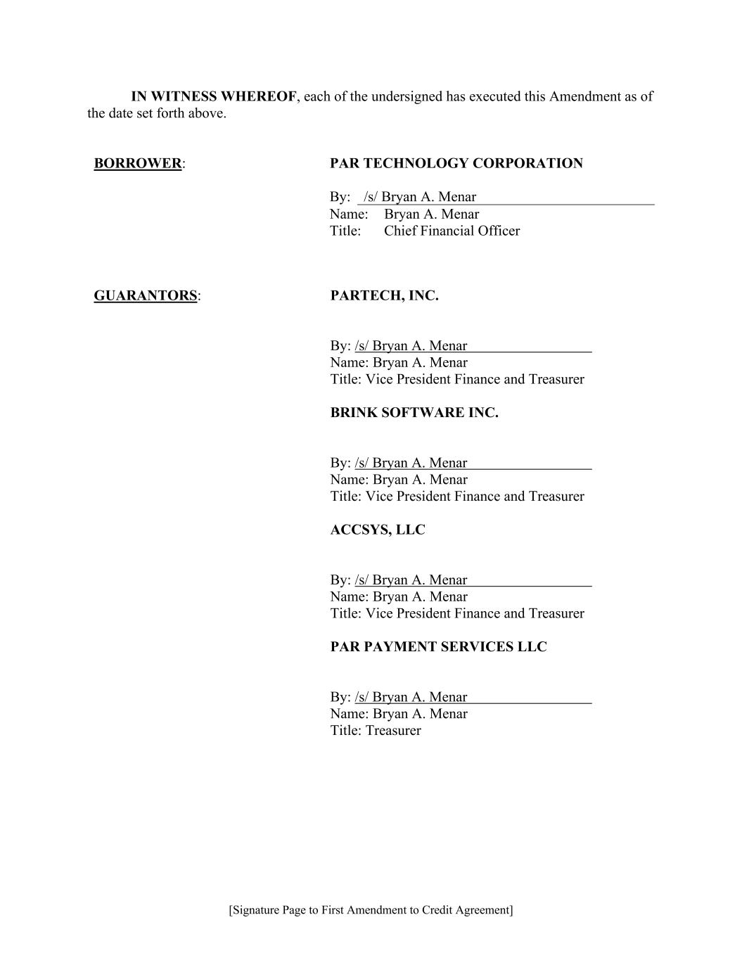 [Signature Page to First Amendment to Credit Agreement] IN WITNESS WHEREOF, each of the undersigned has executed this Amendment as of the date set forth above. BORROWER: PAR TECHNOLOGY CORPORATION By: /s/ Bryan A. Menar Name: Bryan A. Menar Title: Chief Financial Officer GUARANTORS: PARTECH, INC. By: /s/ Bryan A. Menar Name: Bryan A. Menar Title: Vice President Finance and Treasurer BRINK SOFTWARE INC. By: /s/ Bryan A. Menar Name: Bryan A. Menar Title: Vice President Finance and Treasurer ACCSYS, LLC By: /s/ Bryan A. Menar Name: Bryan A. Menar Title: Vice President Finance and Treasurer PAR PAYMENT SERVICES LLC By: /s/ Bryan A. Menar Name: Bryan A. Menar Title: Treasurer