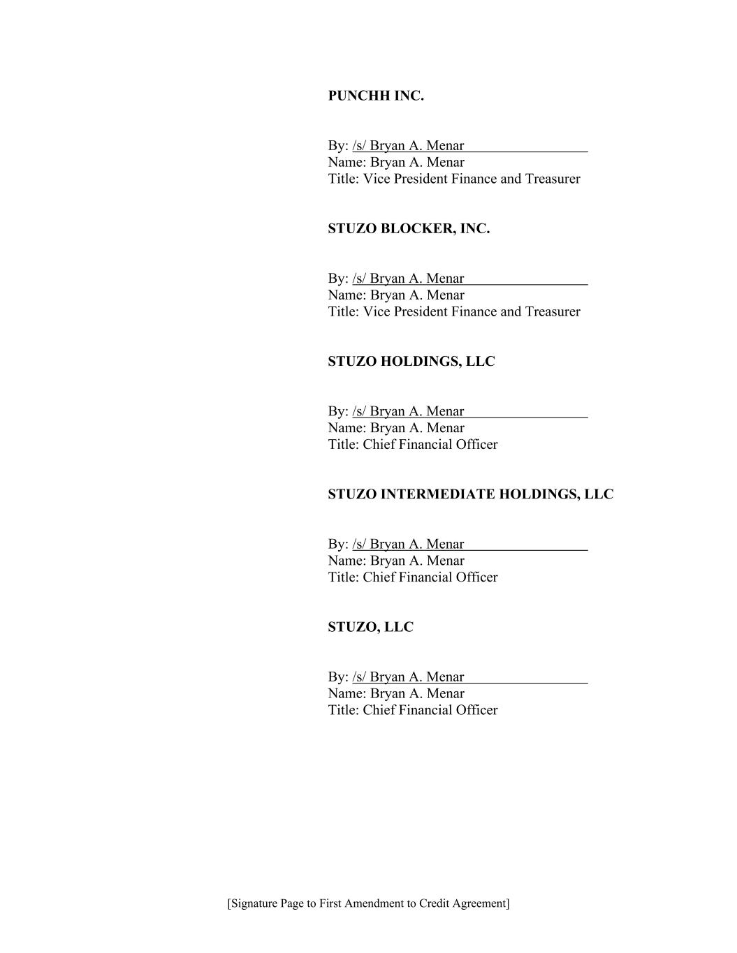 [Signature Page to First Amendment to Credit Agreement] PUNCHH INC. By: /s/ Bryan A. Menar Name: Bryan A. Menar Title: Vice President Finance and Treasurer STUZO BLOCKER, INC. By: /s/ Bryan A. Menar Name: Bryan A. Menar Title: Vice President Finance and Treasurer STUZO HOLDINGS, LLC By: /s/ Bryan A. Menar Name: Bryan A. Menar Title: Chief Financial Officer STUZO INTERMEDIATE HOLDINGS, LLC By: /s/ Bryan A. Menar Name: Bryan A. Menar Title: Chief Financial Officer STUZO, LLC By: /s/ Bryan A. Menar Name: Bryan A. Menar Title: Chief Financial Officer