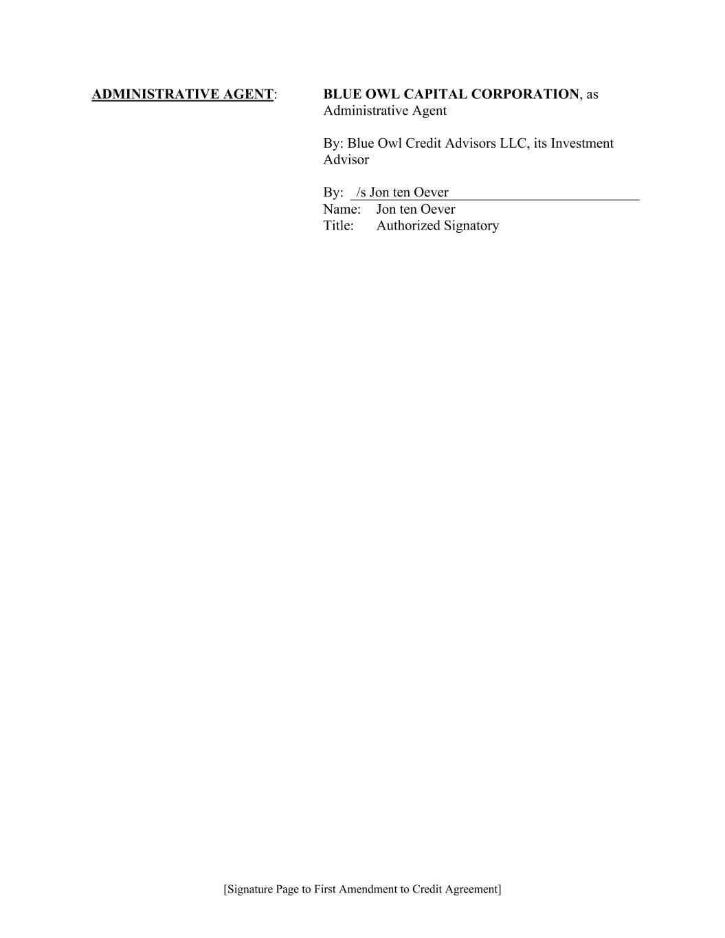 [Signature Page to First Amendment to Credit Agreement] ADMINISTRATIVE AGENT: BLUE OWL CAPITAL CORPORATION, as Administrative Agent By: Blue Owl Credit Advisors LLC, its Investment Advisor By: /s Jon ten Oever Name: Jon ten Oever Title: Authorized Signatory
