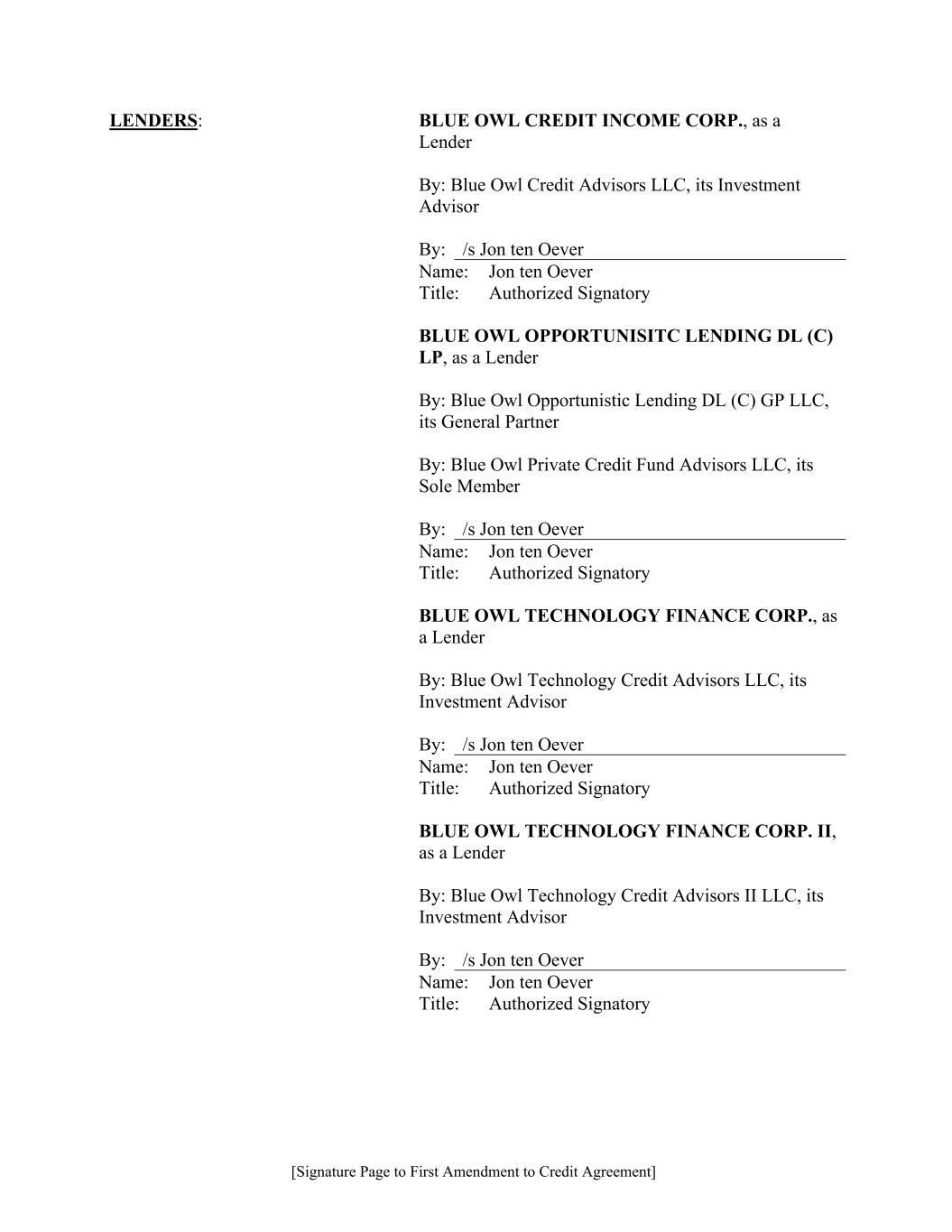 [Signature Page to First Amendment to Credit Agreement] LENDERS: BLUE OWL CREDIT INCOME CORP., as a Lender By: Blue Owl Credit Advisors LLC, its Investment Advisor By: /s Jon ten Oever Name: Jon ten Oever Title: Authorized Signatory BLUE OWL OPPORTUNISITC LENDING DL (C) LP, as a Lender By: Blue Owl Opportunistic Lending DL (C) GP LLC, its General Partner By: Blue Owl Private Credit Fund Advisors LLC, its Sole Member By: /s Jon ten Oever Name: Jon ten Oever Title: Authorized Signatory BLUE OWL TECHNOLOGY FINANCE CORP., as a Lender By: Blue Owl Technology Credit Advisors LLC, its Investment Advisor By: /s Jon ten Oever Name: Jon ten Oever Title: Authorized Signatory BLUE OWL TECHNOLOGY FINANCE CORP. II, as a Lender By: Blue Owl Technology Credit Advisors II LLC, its Investment Advisor By: /s Jon ten Oever Name: Jon ten Oever Title: Authorized Signatory