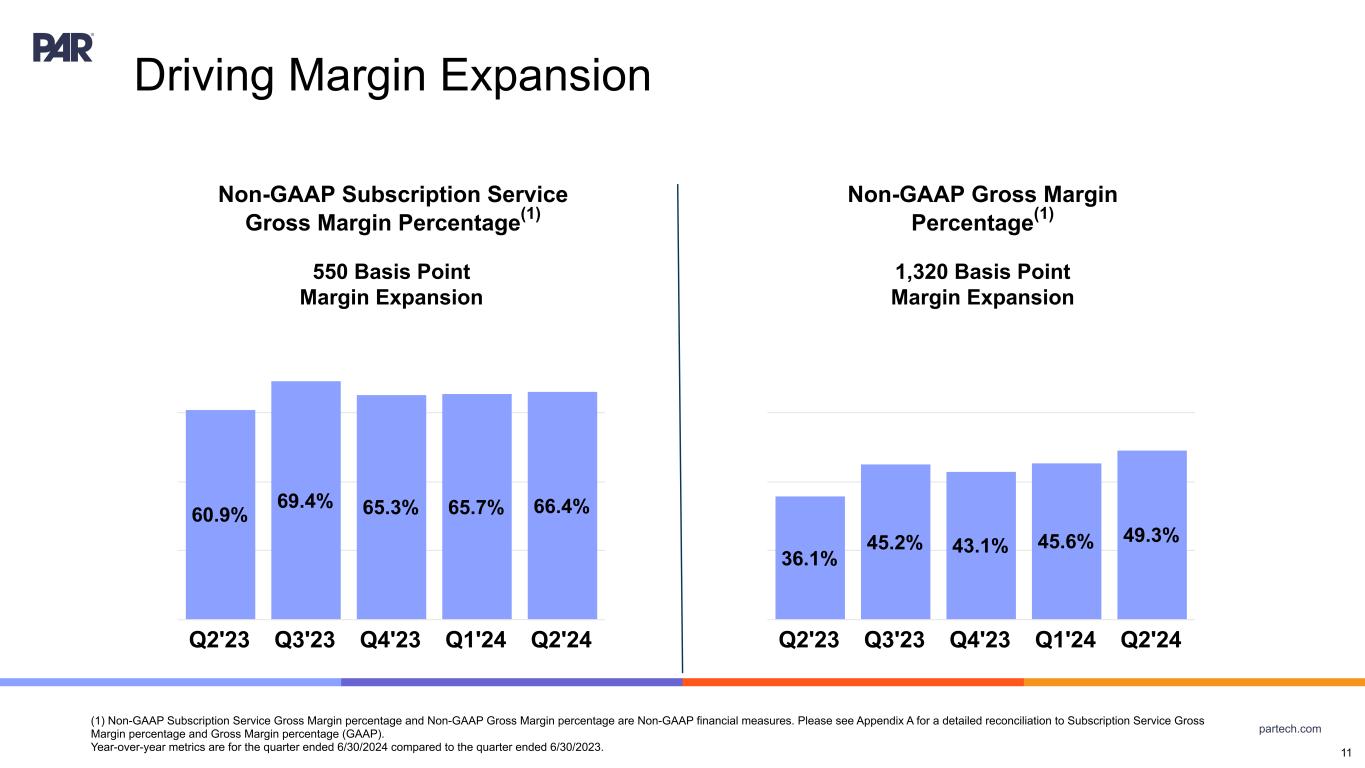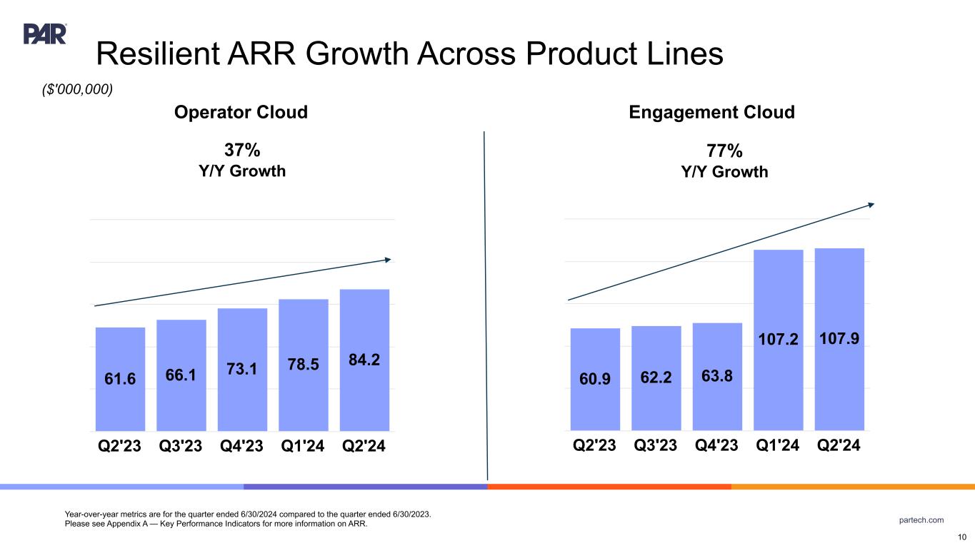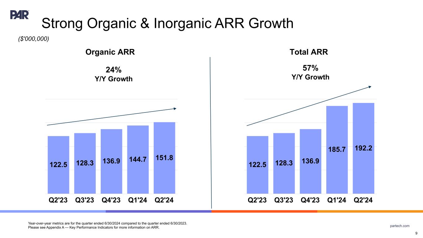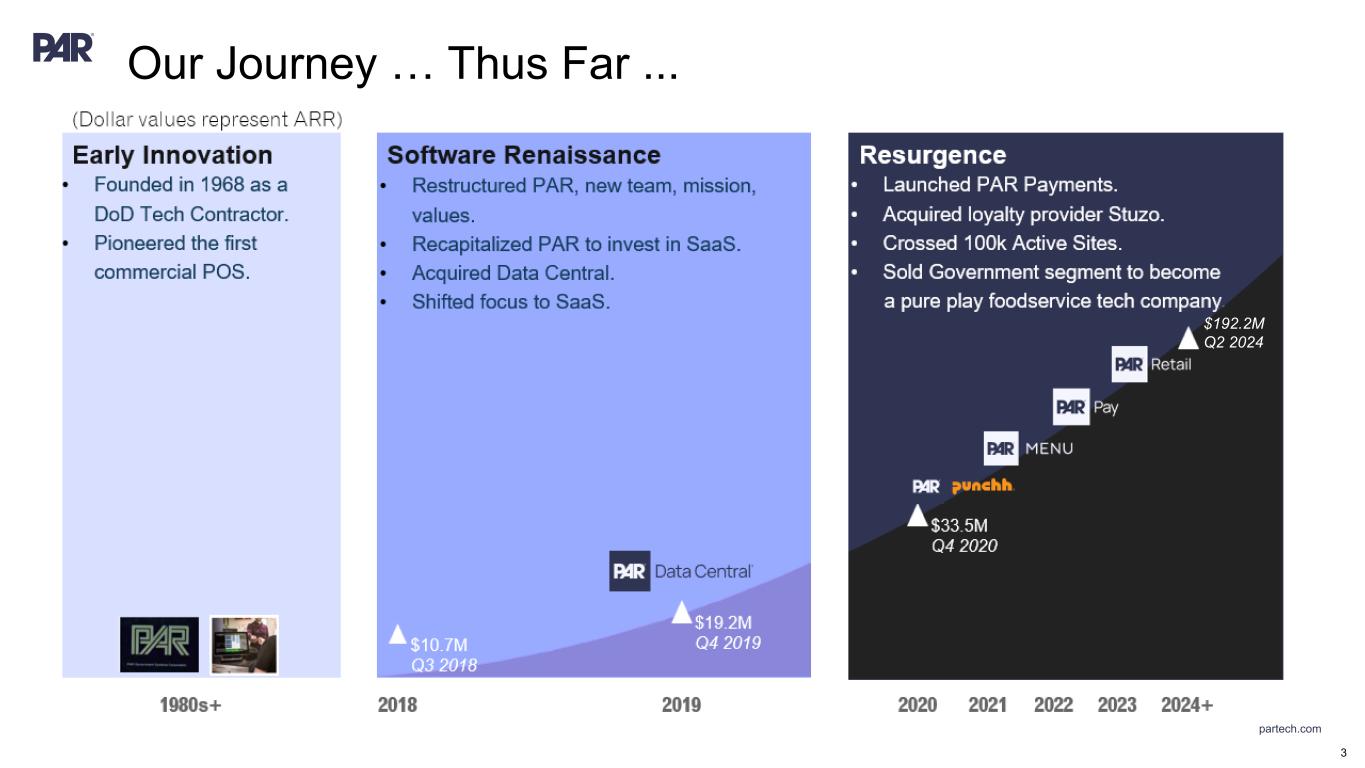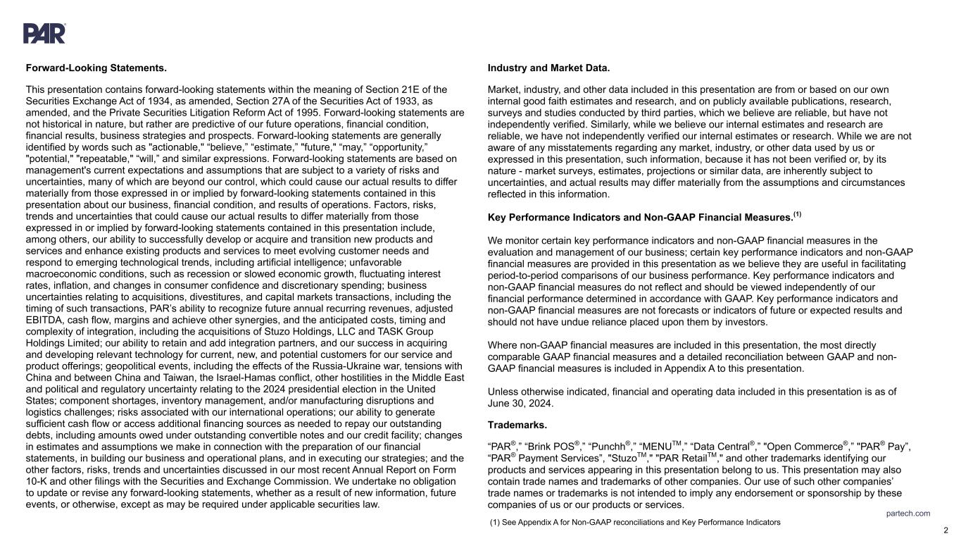 partech.com Forward-Looking Statements. This presentation contains forward-looking statements within the meaning of Section 21E of the Securities Exchange Act of 1934, as amended, Section 27A of the Securities Act of 1933, as amended, and the Private Securities Litigation Reform Act of 1995. Forward-looking statements are not historical in nature, but rather are predictive of our future operations, financial condition, financial results, business strategies and prospects. Forward-looking statements are generally identified by words such as "actionable," “believe,” “estimate,” "future," “may,” “opportunity,” "potential," "repeatable," “will,” and similar expressions. Forward-looking statements are based on management's current expectations and assumptions that are subject to a variety of risks and uncertainties, many of which are beyond our control, which could cause our actual results to differ materially from those expressed in or implied by forward-looking statements contained in this presentation about our business, financial condition, and results of operations. Factors, risks, trends and uncertainties that could cause our actual results to differ materially from those expressed in or implied by forward-looking statements contained in this presentation include, among others, our ability to successfully develop or acquire and transition new products and services and enhance existing products and services to meet evolving customer needs and respond to emerging technological trends, including artificial intelligence; unfavorable macroeconomic conditions, such as recession or slowed economic growth, fluctuating interest rates, inflation, and changes in consumer confidence and discretionary spending; business uncertainties relating to acquisitions, divestitures, and capital markets transactions, including the timing of such transactions, PAR’s ability to recognize future annual recurring revenues, adjusted EBITDA, cash flow, margins and achieve other synergies, and the anticipated costs, timing and complexity of integration, including the acquisitions of Stuzo Holdings, LLC and TASK Group Holdings Limited; our ability to retain and add integration partners, and our success in acquiring and developing relevant technology for current, new, and potential customers for our service and product offerings; geopolitical events, including the effects of the Russia-Ukraine war, tensions with China and between China and Taiwan, the Israel-Hamas conflict, other hostilities in the Middle East and political and regulatory uncertainty relating to the 2024 presidential election in the United States; component shortages, inventory management, and/or manufacturing disruptions and logistics challenges; risks associated with our international operations; our ability to generate sufficient cash flow or access additional financing sources as needed to repay our outstanding debts, including amounts owed under outstanding convertible notes and our credit facility; changes in estimates and assumptions we make in connection with the preparation of our financial statements, in building our business and operational plans, and in executing our strategies; and the other factors, risks, trends and uncertainties discussed in our most recent Annual Report on Form 10-K and other filings with the Securities and Exchange Commission. We undertake no obligation to update or revise any forward-looking statements, whether as a result of new information, future events, or otherwise, except as may be required under applicable securities law. Industry and Market Data. Market, industry, and other data included in this presentation are from or based on our own internal good faith estimates and research, and on publicly available publications, research, surveys and studies conducted by third parties, which we believe are reliable, but have not independently verified. Similarly, while we believe our internal estimates and research are reliable, we have not independently verified our internal estimates or research. While we are not aware of any misstatements regarding any market, industry, or other data used by us or expressed in this presentation, such information, because it has not been verified or, by its nature - market surveys, estimates, projections or similar data, are inherently subject to uncertainties, and actual results may differ materially from the assumptions and circumstances reflected in this information. Key Performance Indicators and Non-GAAP Financial Measures.(1) We monitor certain key performance indicators and non-GAAP financial measures in the evaluation and management of our business; certain key performance indicators and non-GAAP financial measures are provided in this presentation as we believe they are useful in facilitating period-to-period comparisons of our business performance. Key performance indicators and non-GAAP financial measures do not reflect and should be viewed independently of our financial performance determined in accordance with GAAP. Key performance indicators and non-GAAP financial measures are not forecasts or indicators of future or expected results and should not have undue reliance placed upon them by investors. Where non-GAAP financial measures are included in this presentation, the most directly comparable GAAP financial measures and a detailed reconciliation between GAAP and non- GAAP financial measures is included in Appendix A to this presentation. Unless otherwise indicated, financial and operating data included in this presentation is as of June 30, 2024. Trademarks. “PAR®,” “Brink POS®,” “Punchh®,” “MENUTM,” “Data Central®,” "Open Commerce®,” "PAR® Pay”, “PAR® Payment Services”, "StuzoTM," "PAR RetailTM," and other trademarks identifying our products and services appearing in this presentation belong to us. This presentation may also contain trade names and trademarks of other companies. Our use of such other companies