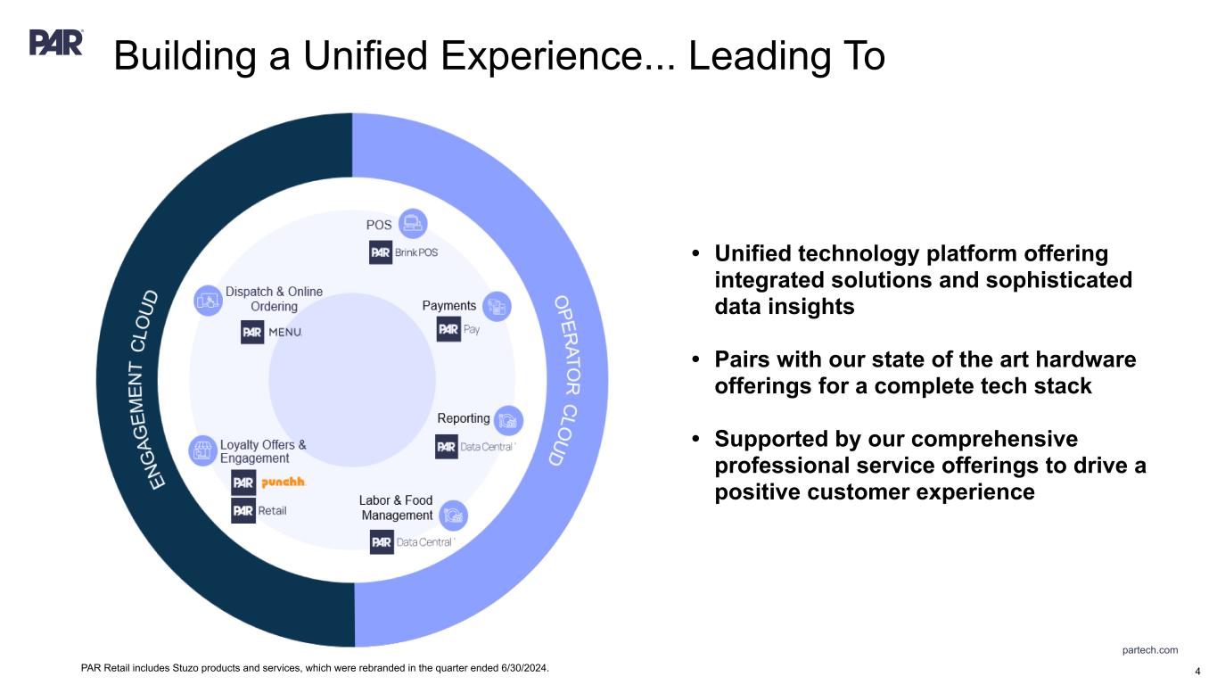 partech.com • Unified technology platform offering integrated solutions and sophisticated data insights • Pairs with our state of the art hardware offerings for a complete tech stack • Supported by our comprehensive professional service offerings to drive a positive customer experience Building a Unified Experience... Leading To 4PAR Retail includes Stuzo products and services, which were rebranded in the quarter ended 6/30/2024.