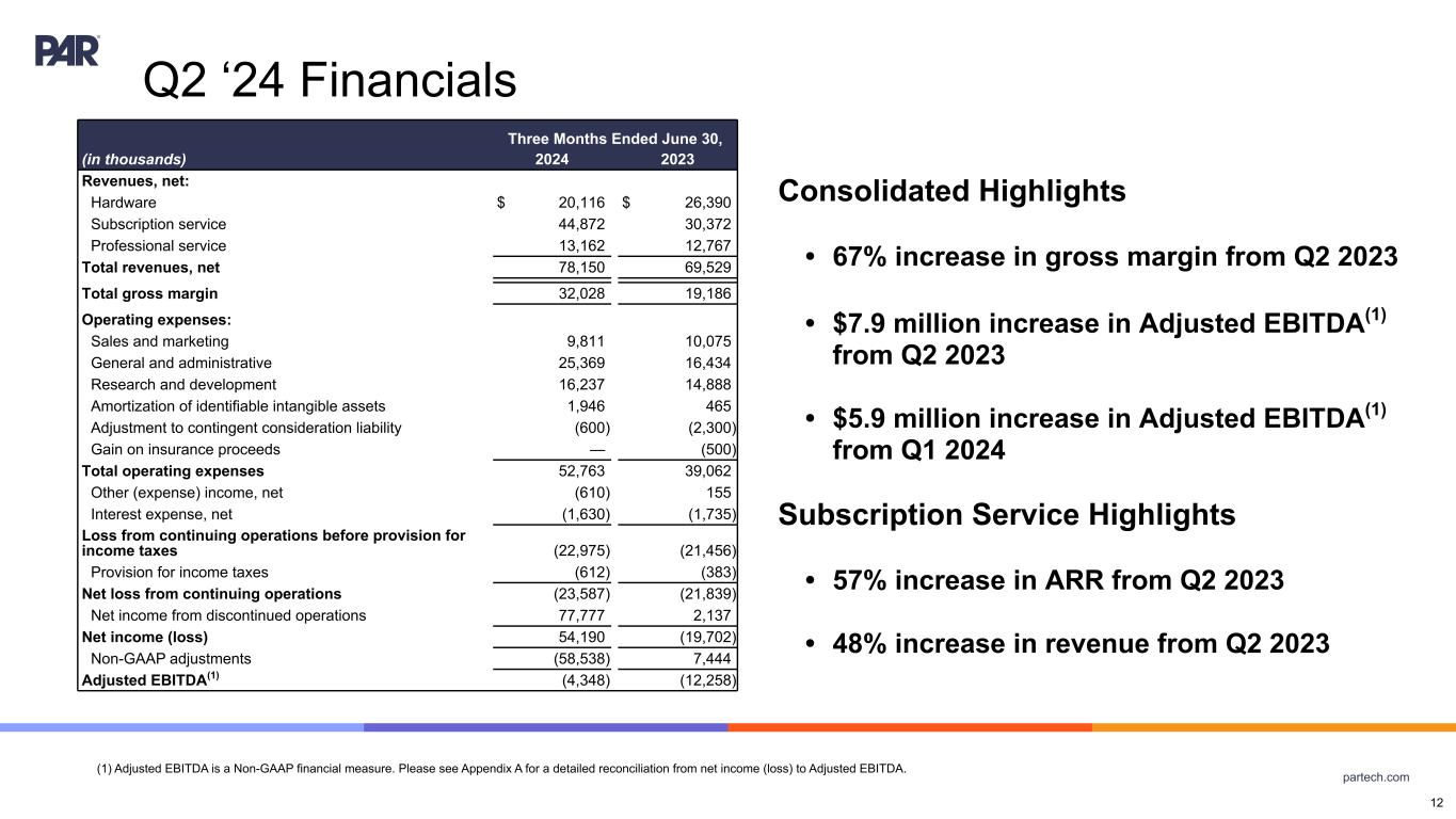 partech.com Q2 ‘24 Financials Consolidated Highlights • 67% increase in gross margin from Q2 2023 • $7.9 million increase in Adjusted EBITDA(1) from Q2 2023 • $5.9 million increase in Adjusted EBITDA(1) from Q1 2024 Subscription Service Highlights • 57% increase in ARR from Q2 2023 • 48% increase in revenue from Q2 2023 Three Months Ended June 30, (in thousands) 2024 2023 Revenues, net: Hardware $ 20,116 $ 26,390 Subscription service 44,872 30,372 Professional service 13,162 12,767 Total revenues, net 78,150 69,529 Total gross margin 32,028 19,186 Operating expenses: Sales and marketing 9,811 10,075 General and administrative 25,369 16,434 Research and development 16,237 14,888 Amortization of identifiable intangible assets 1,946 465 Adjustment to contingent consideration liability (600) (2,300) Gain on insurance proceeds — (500) Total operating expenses 52,763 39,062 Other (expense) income, net (610) 155 Interest expense, net (1,630) (1,735) Loss from continuing operations before provision for income taxes (22,975) (21,456) Provision for income taxes (612) (383) Net loss from continuing operations (23,587) (21,839) Net income from discontinued operations 77,777 2,137 Net income (loss) 54,190 (19,702) Non-GAAP adjustments (58,538) 7,444 Adjusted EBITDA(1) (4,348) (12,258) 12 (1) Adjusted EBITDA is a Non-GAAP financial measure. Please see Appendix A for a detailed reconciliation from net income (loss) to Adjusted EBITDA.