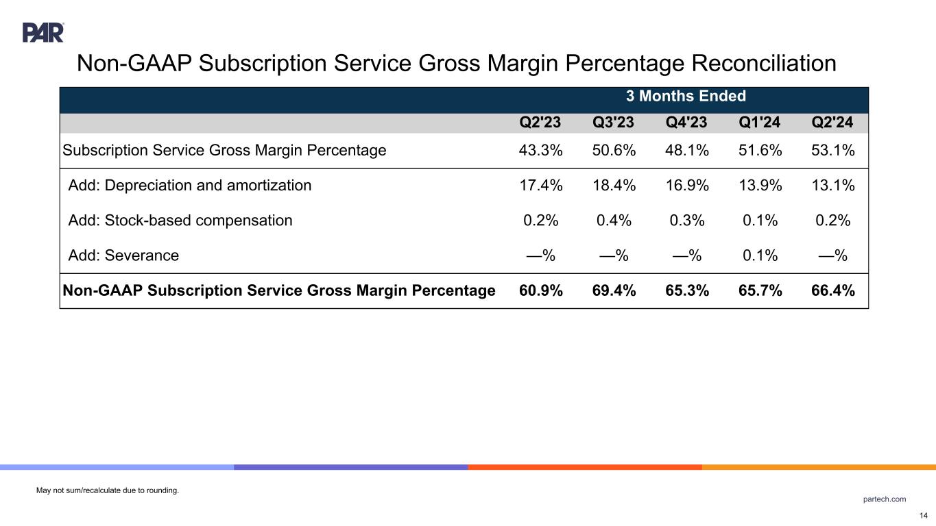 partech.com 3 Months Ended Q2'23 Q3'23 Q4'23 Q1'24 Q2'24 Subscription Service Gross Margin Percentage 43.3% 50.6% 48.1% 51.6% 53.1% Add: Depreciation and amortization 17.4% 18.4% 16.9% 13.9% 13.1% Add: Stock-based compensation 0.2% 0.4% 0.3% 0.1% 0.2% Add: Severance —% —% —% 0.1% —% Non-GAAP Subscription Service Gross Margin Percentage 60.9% 69.4% 65.3% 65.7% 66.4% May not sum/recalculate due to rounding. Non-GAAP Subscription Service Gross Margin Percentage Reconciliation 14