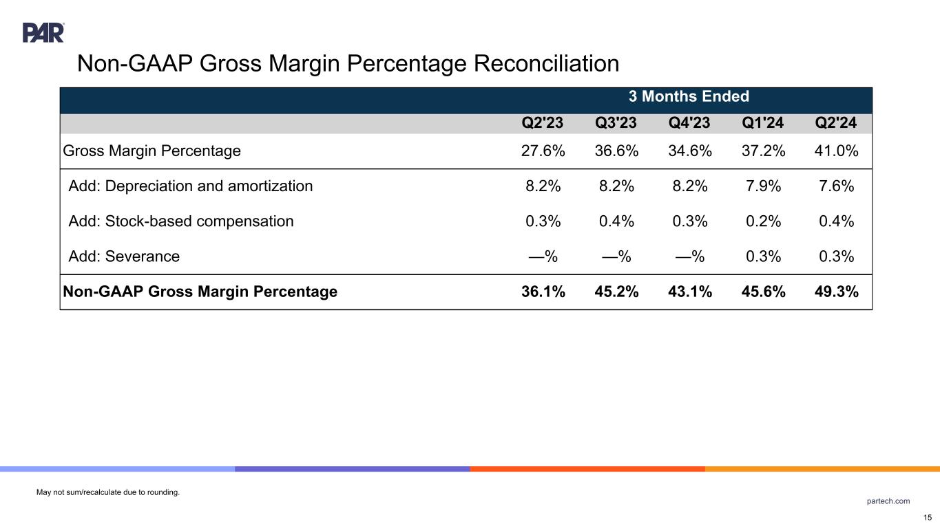 partech.com 3 Months Ended Q2'23 Q3'23 Q4'23 Q1'24 Q2'24 Gross Margin Percentage 27.6% 36.6% 34.6% 37.2% 41.0% Add: Depreciation and amortization 8.2% 8.2% 8.2% 7.9% 7.6% Add: Stock-based compensation 0.3% 0.4% 0.3% 0.2% 0.4% Add: Severance —% —% —% 0.3% 0.3% Non-GAAP Gross Margin Percentage 36.1% 45.2% 43.1% 45.6% 49.3% May not sum/recalculate due to rounding. Non-GAAP Gross Margin Percentage Reconciliation 15