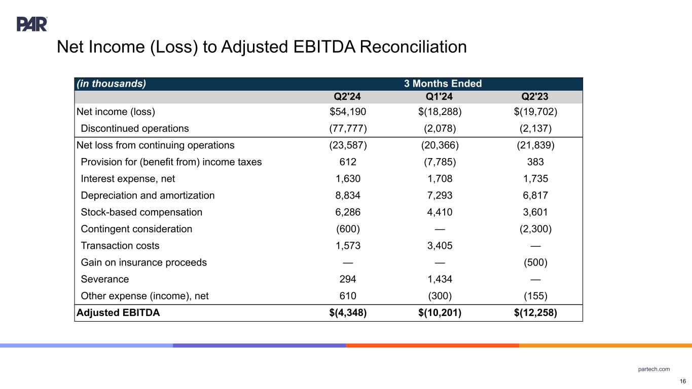 partech.com (in thousands) 3 Months Ended Q2'24 Q1'24 Q2'23 Net income (loss) $54,190 $(18,288) $(19,702) Discontinued operations (77,777) (2,078) (2,137) Net loss from continuing operations (23,587) (20,366) (21,839) Provision for (benefit from) income taxes 612 (7,785) 383 Interest expense, net 1,630 1,708 1,735 Depreciation and amortization 8,834 7,293 6,817 Stock-based compensation 6,286 4,410 3,601 Contingent consideration (600) — (2,300) Transaction costs 1,573 3,405 — Gain on insurance proceeds — — (500) Severance 294 1,434 — Other expense (income), net 610 (300) (155) Adjusted EBITDA $(4,348) $(10,201) $(12,258) 16 Net Income (Loss) to Adjusted EBITDA Reconciliation
