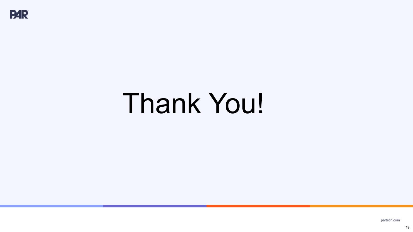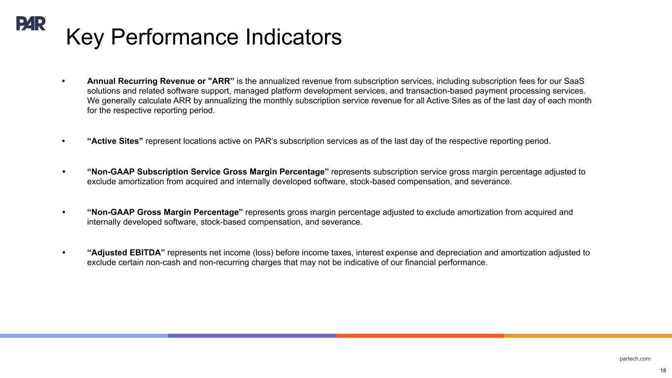 partech.com • Annual Recurring Revenue or "ARR” is the annualized revenue from subscription services, including subscription fees for our SaaS solutions and related software support, managed platform development services, and transaction-based payment processing services. We generally calculate ARR by annualizing the monthly subscription service revenue for all Active Sites as of the last day of each month for the respective reporting period. • “Active Sites” represent locations active on PAR’s subscription services as of the last day of the respective reporting period. • “Non-GAAP Subscription Service Gross Margin Percentage” represents subscription service gross margin percentage adjusted to exclude amortization from acquired and internally developed software, stock-based compensation, and severance. • “Non-GAAP Gross Margin Percentage” represents gross margin percentage adjusted to exclude amortization from acquired and internally developed software, stock-based compensation, and severance. • “Adjusted EBITDA” represents net income (loss) before income taxes, interest expense and depreciation and amortization adjusted to exclude certain non-cash and non-recurring charges that may not be indicative of our financial performance. Key Performance Indicators 18