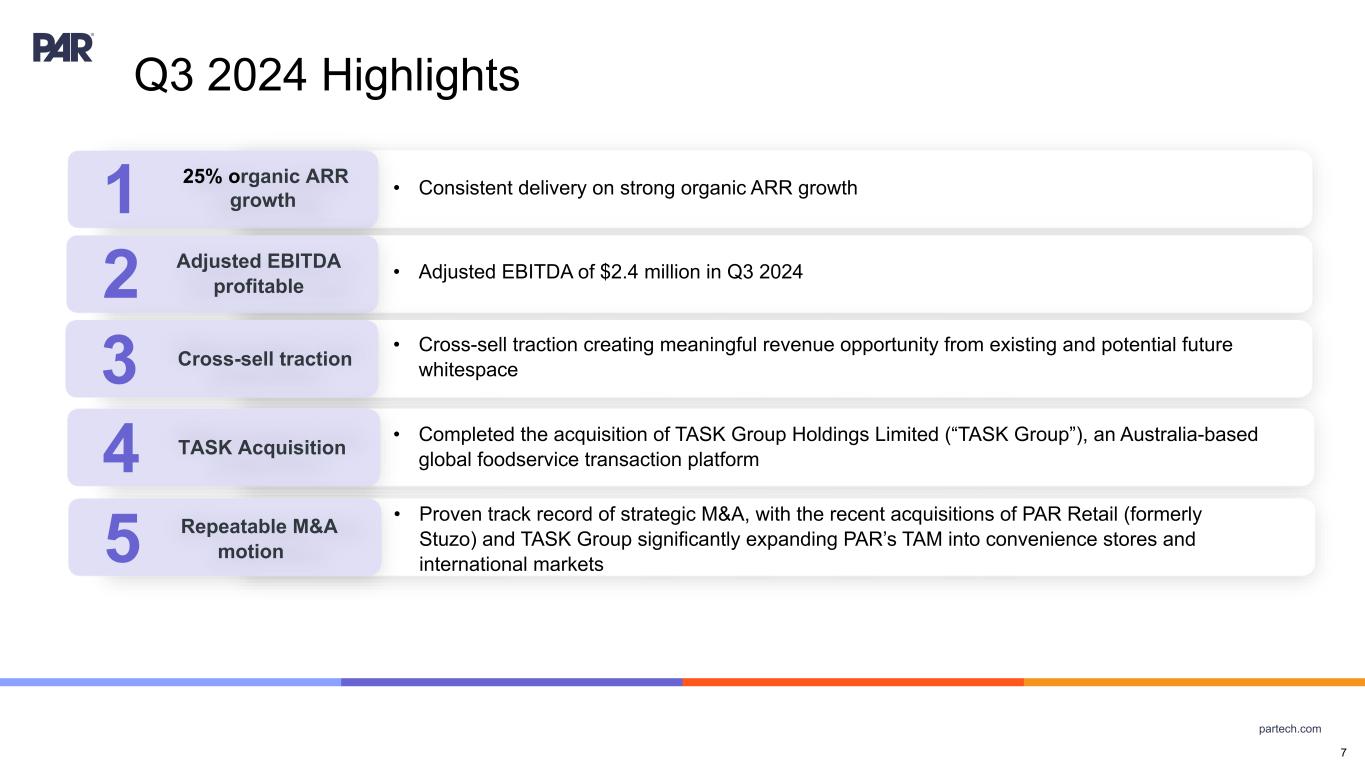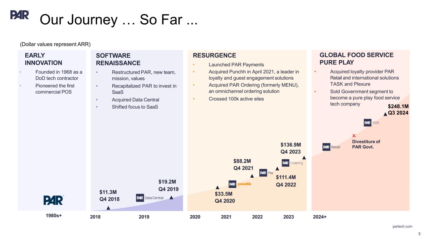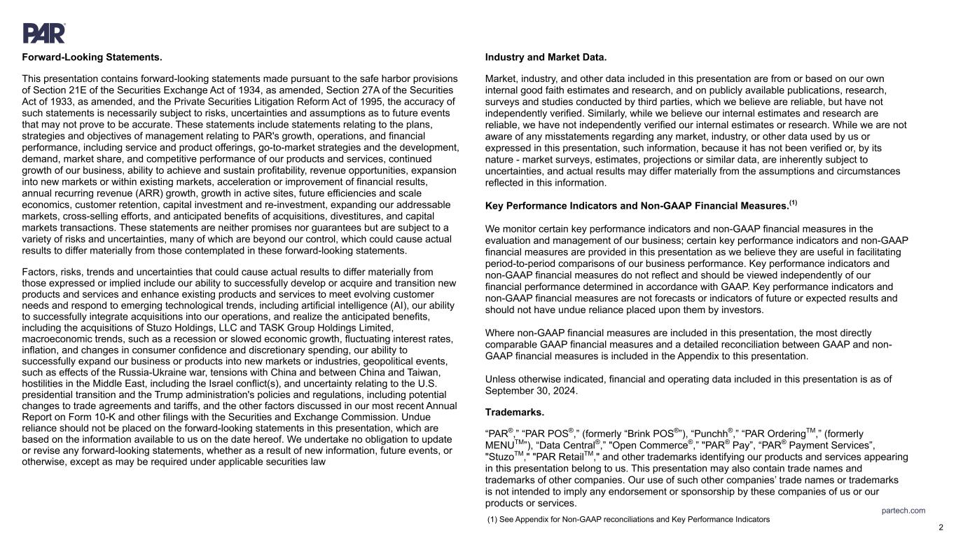 partech.com Forward-Looking Statements. This presentation contains forward-looking statements made pursuant to the safe harbor provisions of Section 21E of the Securities Exchange Act of 1934, as amended, Section 27A of the Securities Act of 1933, as amended, and the Private Securities Litigation Reform Act of 1995, the accuracy of such statements is necessarily subject to risks, uncertainties and assumptions as to future events that may not prove to be accurate. These statements include statements relating to the plans, strategies and objectives of management relating to PAR's growth, operations, and financial performance, including service and product offerings, go-to-market strategies and the development, demand, market share, and competitive performance of our products and services, continued growth of our business, ability to achieve and sustain profitability, revenue opportunities, expansion into new markets or within existing markets, acceleration or improvement of financial results, annual recurring revenue (ARR) growth, growth in active sites, future efficiencies and scale economics, customer retention, capital investment and re-investment, expanding our addressable markets, cross-selling efforts, and anticipated benefits of acquisitions, divestitures, and capital markets transactions. These statements are neither promises nor guarantees but are subject to a variety of risks and uncertainties, many of which are beyond our control, which could cause actual results to differ materially from those contemplated in these forward-looking statements. Factors, risks, trends and uncertainties that could cause actual results to differ materially from those expressed or implied include our ability to successfully develop or acquire and transition new products and services and enhance existing products and services to meet evolving customer needs and respond to emerging technological trends, including artificial intelligence (AI), our ability to successfully integrate acquisitions into our operations, and realize the anticipated benefits, including the acquisitions of Stuzo Holdings, LLC and TASK Group Holdings Limited, macroeconomic trends, such as a recession or slowed economic growth, fluctuating interest rates, inflation, and changes in consumer confidence and discretionary spending, our ability to successfully expand our business or products into new markets or industries, geopolitical events, such as effects of the Russia-Ukraine war, tensions with China and between China and Taiwan, hostilities in the Middle East, including the Israel conflict(s), and uncertainty relating to the U.S. presidential transition and the Trump administration's policies and regulations, including potential changes to trade agreements and tariffs, and the other factors discussed in our most recent Annual Report on Form 10-K and other filings with the Securities and Exchange Commission. Undue reliance should not be placed on the forward-looking statements in this presentation, which are based on the information available to us on the date hereof. We undertake no obligation to update or revise any forward-looking statements, whether as a result of new information, future events, or otherwise, except as may be required under applicable securities law Industry and Market Data. Market, industry, and other data included in this presentation are from or based on our own internal good faith estimates and research, and on publicly available publications, research, surveys and studies conducted by third parties, which we believe are reliable, but have not independently verified. Similarly, while we believe our internal estimates and research are reliable, we have not independently verified our internal estimates or research. While we are not aware of any misstatements regarding any market, industry, or other data used by us or expressed in this presentation, such information, because it has not been verified or, by its nature - market surveys, estimates, projections or similar data, are inherently subject to uncertainties, and actual results may differ materially from the assumptions and circumstances reflected in this information. Key Performance Indicators and Non-GAAP Financial Measures.(1) We monitor certain key performance indicators and non-GAAP financial measures in the evaluation and management of our business; certain key performance indicators and non-GAAP financial measures are provided in this presentation as we believe they are useful in facilitating period-to-period comparisons of our business performance. Key performance indicators and non-GAAP financial measures do not reflect and should be viewed independently of our financial performance determined in accordance with GAAP. Key performance indicators and non-GAAP financial measures are not forecasts or indicators of future or expected results and should not have undue reliance placed upon them by investors. Where non-GAAP financial measures are included in this presentation, the most directly comparable GAAP financial measures and a detailed reconciliation between GAAP and non- GAAP financial measures is included in the Appendix to this presentation. Unless otherwise indicated, financial and operating data included in this presentation is as of September 30, 2024. Trademarks. “PAR®,” “PAR POS®,” (formerly “Brink POS®”), “Punchh®,” “PAR OrderingTM,” (formerly MENUTM”), “Data Central®,” "Open Commerce®,” "PAR® Pay”, “PAR® Payment Services”, "StuzoTM," "PAR RetailTM," and other trademarks identifying our products and services appearing in this presentation belong to us. This presentation may also contain trade names and trademarks of other companies. Our use of such other companies’ trade names or trademarks is not intended to imply any endorsement or sponsorship by these companies of us or our products or services. (1) See Appendix for Non-GAAP reconciliations and Key Performance Indicators 2