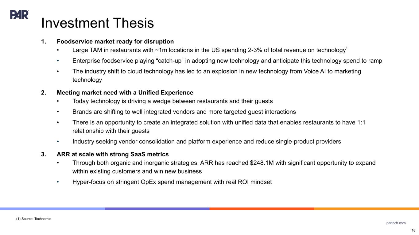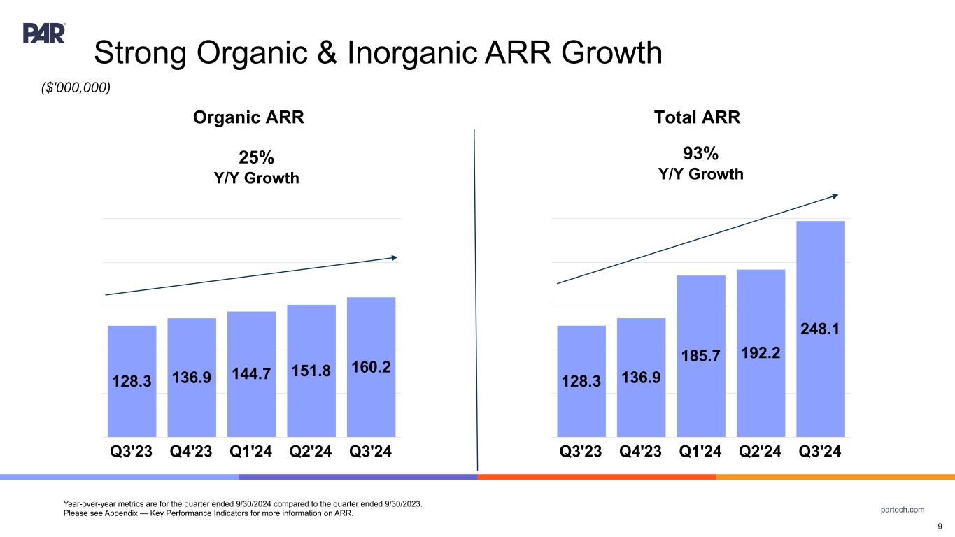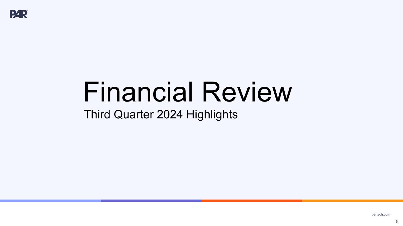 partech.com Forward-Looking Statements. This presentation contains forward-looking statements made pursuant to the safe harbor provisions of Section 21E of the Securities Exchange Act of 1934, as amended, Section 27A of the Securities Act of 1933, as amended, and the Private Securities Litigation Reform Act of 1995, the accuracy of such statements is necessarily subject to risks, uncertainties and assumptions as to future events that may not prove to be accurate. These statements include statements relating to the plans, strategies and objectives of management relating to PAR's growth, operations, and financial performance, including service and product offerings, go-to-market strategies and the development, demand, market share, and competitive performance of our products and services, continued growth of our business, ability to achieve and sustain profitability, revenue opportunities, expansion into new markets or within existing markets, acceleration or improvement of financial results, annual recurring revenue (ARR) growth, growth in active sites, future efficiencies and scale economics, customer retention, capital investment and re-investment, expanding our addressable markets, cross-selling efforts, and anticipated benefits of acquisitions, divestitures, and capital markets transactions. These statements are neither promises nor guarantees but are subject to a variety of risks and uncertainties, many of which are beyond our control, which could cause actual results to differ materially from those contemplated in these forward-looking statements. Factors, risks, trends and uncertainties that could cause actual results to differ materially from those expressed or implied include our ability to successfully develop or acquire and transition new products and services and enhance existing products and services to meet evolving customer needs and respond to emerging technological trends, including artificial intelligence (AI), our ability to successfully integrate acquisitions into our operations, and realize the anticipated benefits, including the acquisitions of Stuzo Holdings, LLC and TASK Group Holdings Limited, macroeconomic trends, such as a recession or slowed economic growth, fluctuating interest rates, inflation, and changes in consumer confidence and discretionary spending, our ability to successfully expand our business or products into new markets or industries, geopolitical events, such as effects of the Russia-Ukraine war, tensions with China and between China and Taiwan, hostilities in the Middle East, including the Israel conflict(s), and uncertainty relating to the U.S. presidential transition and the Trump administration's policies and regulations, including potential changes to trade agreements and tariffs, and the other factors discussed in our most recent Annual Report on Form 10-K and other filings with the Securities and Exchange Commission. Undue reliance should not be placed on the forward-looking statements in this presentation, which are based on the information available to us on the date hereof. We undertake no obligation to update or revise any forward-looking statements, whether as a result of new information, future events, or otherwise, except as may be required under applicable securities law Industry and Market Data. Market, industry, and other data included in this presentation are from or based on our own internal good faith estimates and research, and on publicly available publications, research, surveys and studies conducted by third parties, which we believe are reliable, but have not independently verified. Similarly, while we believe our internal estimates and research are reliable, we have not independently verified our internal estimates or research. While we are not aware of any misstatements regarding any market, industry, or other data used by us or expressed in this presentation, such information, because it has not been verified or, by its nature - market surveys, estimates, projections or similar data, are inherently subject to uncertainties, and actual results may differ materially from the assumptions and circumstances reflected in this information. Key Performance Indicators and Non-GAAP Financial Measures.(1) We monitor certain key performance indicators and non-GAAP financial measures in the evaluation and management of our business; certain key performance indicators and non-GAAP financial measures are provided in this presentation as we believe they are useful in facilitating period-to-period comparisons of our business performance. Key performance indicators and non-GAAP financial measures do not reflect and should be viewed independently of our financial performance determined in accordance with GAAP. Key performance indicators and non-GAAP financial measures are not forecasts or indicators of future or expected results and should not have undue reliance placed upon them by investors. Where non-GAAP financial measures are included in this presentation, the most directly comparable GAAP financial measures and a detailed reconciliation between GAAP and non- GAAP financial measures is included in the Appendix to this presentation. Unless otherwise indicated, financial and operating data included in this presentation is as of September 30, 2024. Trademarks. “PAR®,” “PAR POS®,” (formerly “Brink POS®”), “Punchh®,” “PAR OrderingTM,” (formerly MENUTM”), “Data Central®,” "Open Commerce®,” "PAR® Pay”, “PAR® Payment Services”, "StuzoTM," "PAR RetailTM," and other trademarks identifying our products and services appearing in this presentation belong to us. This presentation may also contain trade names and trademarks of other companies. Our use of such other companies’ trade names or trademarks is not intended to imply any endorsement or sponsorship by these companies of us or our products or services. (1) See Appendix for Non-GAAP reconciliations and Key Performance Indicators 2