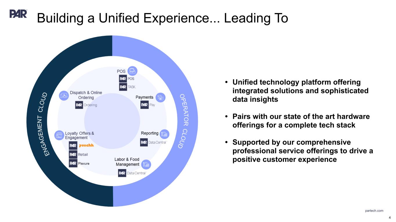 partech.com Our Journey … So Far ... 3 GLOBAL FOOD SERVICE PURE PLAY • Acquired loyalty provider PAR Retail and international solutions TASK and Plexure • Sold Government segment to become a pure play food service tech company 1980s+ EARLY INNOVATION • Founded in 1968 as a DoD tech contractor • Pioneered the first commercial POS 2018 2019 SOFTWARE RENAISSANCE • Restructured PAR, new team, mission, values • Recapitalized PAR to invest in SaaS • Acquired Data Central • Shifted focus to SaaS $11.3M Q4 2018 ▲ 2020 2021 2022 RESURGENCE • Launched PAR Payments • Acquired Punchh in April 2021, a leader in loyalty and guest engagement solutions • Acquired PAR Ordering (formerly MENU), an omnichannel ordering solution • Crossed 100k active sites ▲ $33.5M Q4 2020 2023 2024+ $19.2M Q4 2019 ▲ $136.9M Q4 2023 ▲$88.2M Q4 2021 ▲ ▲ $111.4M Q4 2022 ▲ Divestiture of PAR Govt. $248.1M Q3 2024 (Dollar values represent ARR) 🗴🗴