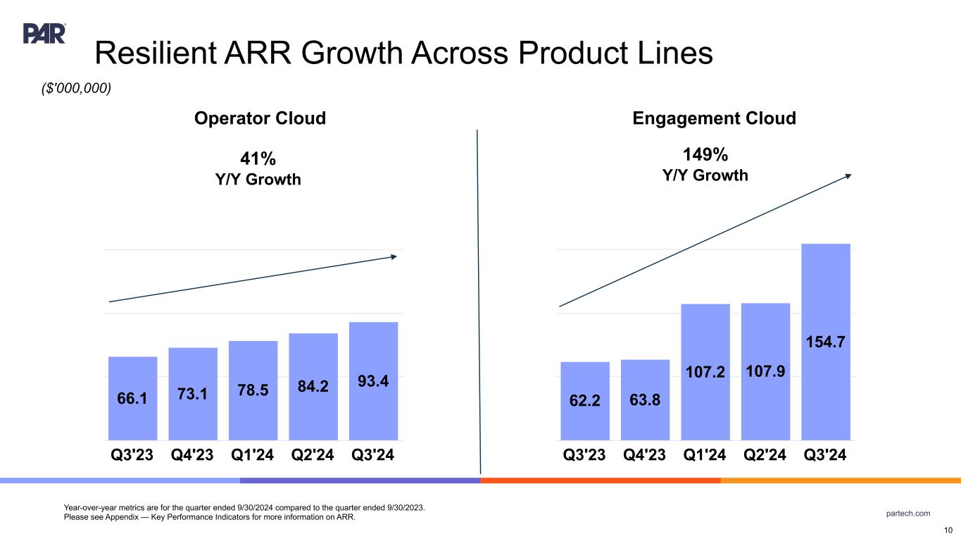 partech.com Strong Organic & Inorganic ARR Growth Year-over-year metrics are for the quarter ended 9/30/2024 compared to the quarter ended 9/30/2023. Please see Appendix — Key Performance Indicators for more information on ARR. 128.3 136.9 144.7 151.8 160.2 Q3'23 Q4'23 Q1'24 Q2'24 Q3'24 128.3 136.9 185.7 192.2 248.1 Q3'23 Q4'23 Q1'24 Q2'24 Q3'24 9 Organic ARR 25% Y/Y Growth Total ARR 93% Y/Y Growth ($'000,000)
