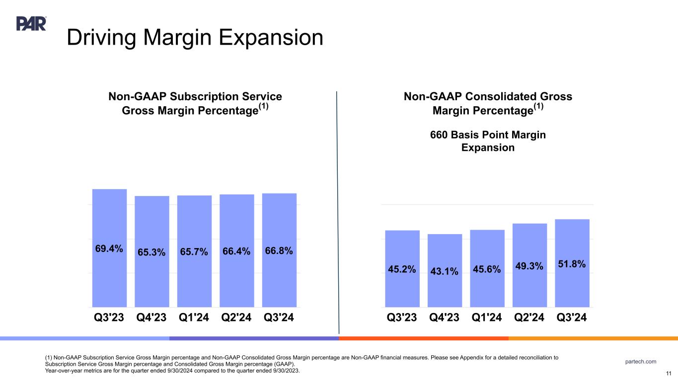 partech.com Resilient ARR Growth Across Product Lines Year-over-year metrics are for the quarter ended 9/30/2024 compared to the quarter ended 9/30/2023. Please see Appendix — Key Performance Indicators for more information on ARR. 66.1 73.1 78.5 84.2 93.4 Q3'23 Q4'23 Q1'24 Q2'24 Q3'24 62.2 63.8 107.2 107.9 154.7 Q3'23 Q4'23 Q1'24 Q2'24 Q3'24 10 Operator Cloud 41% Y/Y Growth Engagement Cloud 149% Y/Y Growth ($'000,000)