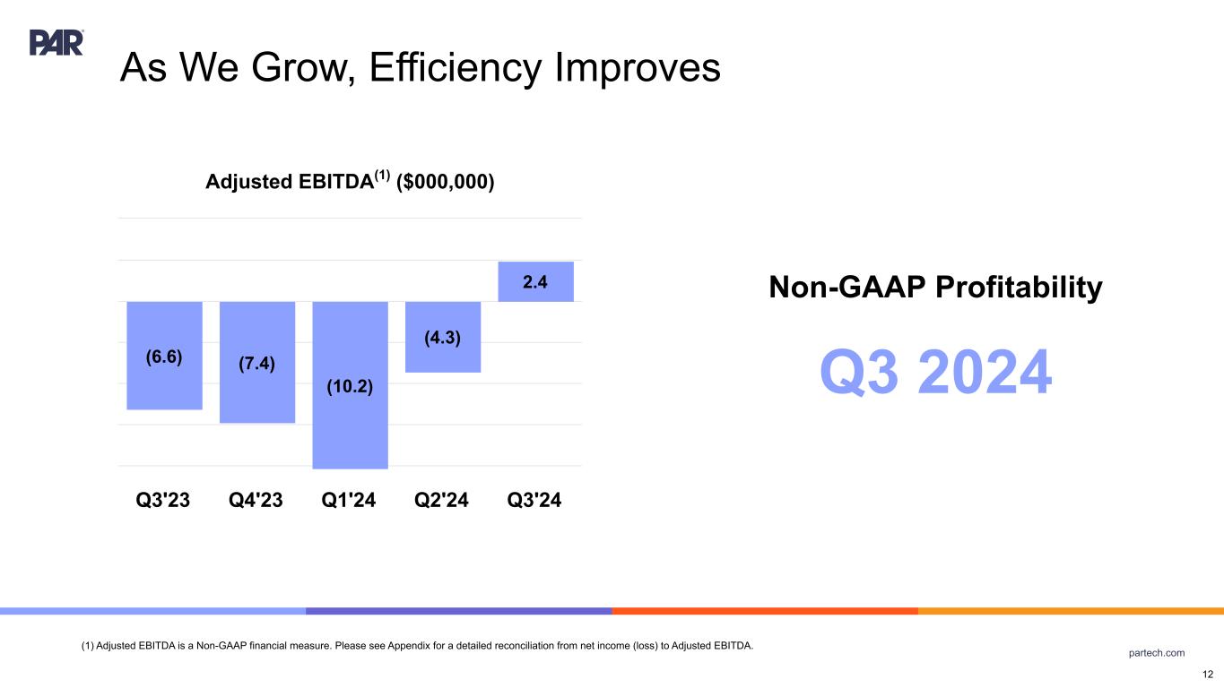 partech.com Driving Margin Expansion (1) Non-GAAP Subscription Service Gross Margin percentage and Non-GAAP Consolidated Gross Margin percentage are Non-GAAP financial measures. Please see Appendix for a detailed reconciliation to Subscription Service Gross Margin percentage and Consolidated Gross Margin percentage (GAAP). Year-over-year metrics are for the quarter ended 9/30/2024 compared to the quarter ended 9/30/2023. 69.4% 65.3% 65.7% 66.4% 66.8% Q3'23 Q4'23 Q1'24 Q2'24 Q3'24 11 Non-GAAP Subscription Service Gross Margin Percentage(1) 45.2% 43.1% 45.6% 49.3% 51.8% Q3'23 Q4'23 Q1'24 Q2'24 Q3'24 660 Basis Point Margin Expansion Non-GAAP Consolidated Gross Margin Percentage(1)