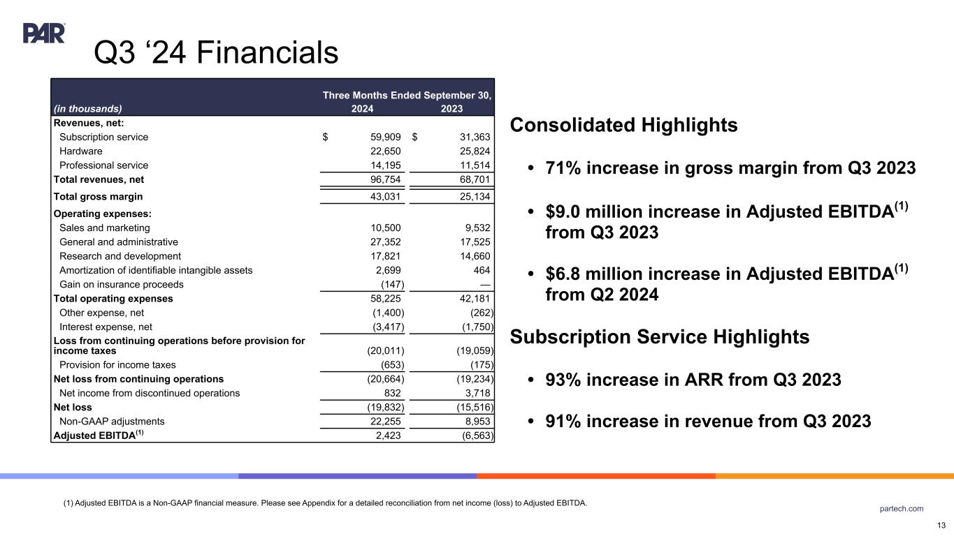 partech.com Q3 ‘24 Financials Consolidated Highlights • 71% increase in gross margin from Q3 2023 • $9.0 million increase in Adjusted EBITDA(1) from Q3 2023 • $6.8 million increase in Adjusted EBITDA(1) from Q2 2024 Subscription Service Highlights • 93% increase in ARR from Q3 2023 • 91% increase in revenue from Q3 2023 Three Months Ended September 30, (in thousands) 2024 2023 Revenues, net: Subscription service $ 59,909 $ 31,363 Hardware 22,650 25,824 Professional service 14,195 11,514 Total revenues, net 96,754 68,701 Total gross margin 43,031 25,134 Operating expenses: Sales and marketing 10,500 9,532 General and administrative 27,352 17,525 Research and development 17,821 14,660 Amortization of identifiable intangible assets 2,699 464 Gain on insurance proceeds (147) — Total operating expenses 58,225 42,181 Other expense, net (1,400) (262) Interest expense, net (3,417) (1,750) Loss from continuing operations before provision for income taxes (20,011) (19,059) Provision for income taxes (653) (175) Net loss from continuing operations (20,664) (19,234) Net income from discontinued operations 832 3,718 Net loss (19,832) (15,516) Non-GAAP adjustments 22,255 8,953 Adjusted EBITDA(1) 2,423 (6,563) 13 (1) Adjusted EBITDA is a Non-GAAP financial measure. Please see Appendix for a detailed reconciliation from net income (loss) to Adjusted EBITDA.
