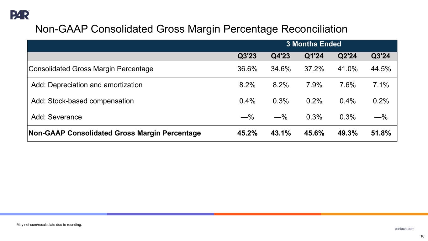 partech.com 3 Months Ended Q3'23 Q4'23 Q1'24 Q2'24 Q3'24 Consolidated Gross Margin Percentage 36.6% 34.6% 37.2% 41.0% 44.5% Add: Depreciation and amortization 8.2% 8.2% 7.9% 7.6% 7.1% Add: Stock-based compensation 0.4% 0.3% 0.2% 0.4% 0.2% Add: Severance —% —% 0.3% 0.3% —% Non-GAAP Consolidated Gross Margin Percentage 45.2% 43.1% 45.6% 49.3% 51.8% May not sum/recalculate due to rounding. Non-GAAP Consolidated Gross Margin Percentage Reconciliation 16