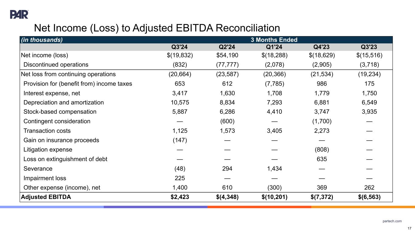 partech.com (in thousands) 3 Months Ended Q3'24 Q2'24 Q1'24 Q4'23 Q3'23 Net income (loss) $(19,832) $54,190 $(18,288) $(18,629) $(15,516) Discontinued operations (832) (77,777) (2,078) (2,905) (3,718) Net loss from continuing operations (20,664) (23,587) (20,366) (21,534) (19,234) Provision for (benefit from) income taxes 653 612 (7,785) 986 175 Interest expense, net 3,417 1,630 1,708 1,779 1,750 Depreciation and amortization 10,575 8,834 7,293 6,881 6,549 Stock-based compensation 5,887 6,286 4,410 3,747 3,935 Contingent consideration — (600) — (1,700) — Transaction costs 1,125 1,573 3,405 2,273 — Gain on insurance proceeds (147) — — — — Litigation expense — — — (808) — Loss on extinguishment of debt — — — 635 — Severance (48) 294 1,434 — — Impairment loss 225 — — — — Other expense (income), net 1,400 610 (300) 369 262 Adjusted EBITDA $2,423 $(4,348) $(10,201) $(7,372) $(6,563) 17 Net Income (Loss) to Adjusted EBITDA Reconciliation