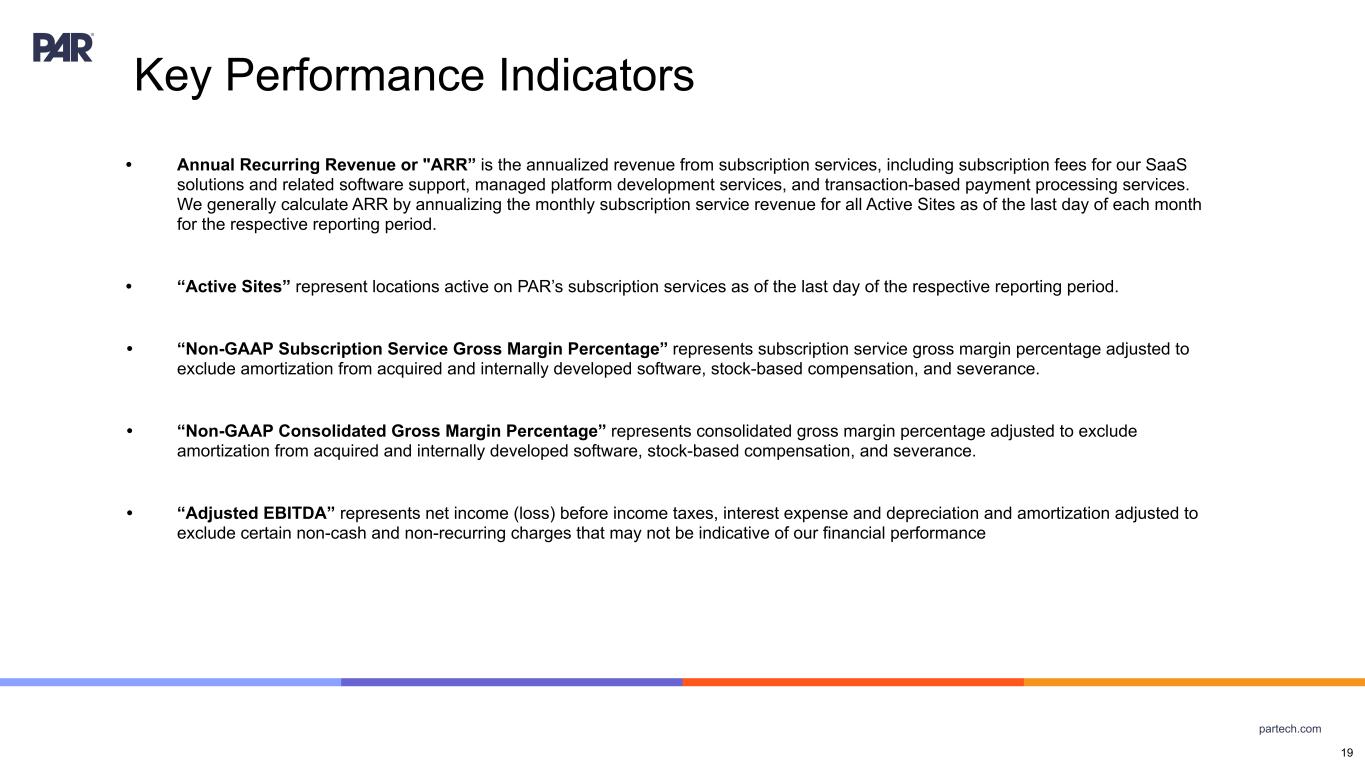 partech.com • Annual Recurring Revenue or "ARR” is the annualized revenue from subscription services, including subscription fees for our SaaS solutions and related software support, managed platform development services, and transaction-based payment processing services. We generally calculate ARR by annualizing the monthly subscription service revenue for all Active Sites as of the last day of each month for the respective reporting period. • “Active Sites” represent locations active on PAR’s subscription services as of the last day of the respective reporting period. • “Non-GAAP Subscription Service Gross Margin Percentage” represents subscription service gross margin percentage adjusted to exclude amortization from acquired and internally developed software, stock-based compensation, and severance. • “Non-GAAP Consolidated Gross Margin Percentage” represents consolidated gross margin percentage adjusted to exclude amortization from acquired and internally developed software, stock-based compensation, and severance. • “Adjusted EBITDA” represents net income (loss) before income taxes, interest expense and depreciation and amortization adjusted to exclude certain non-cash and non-recurring charges that may not be indicative of our financial performance Key Performance Indicators 19