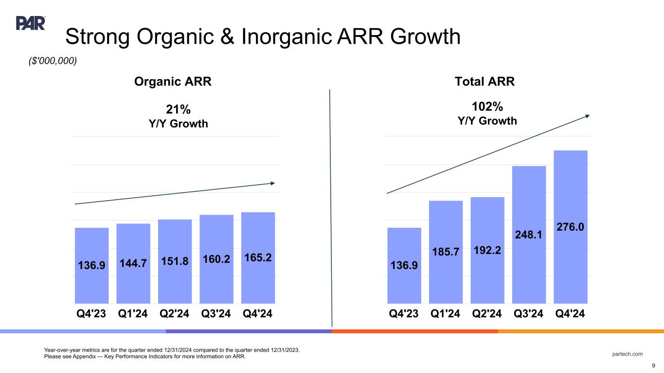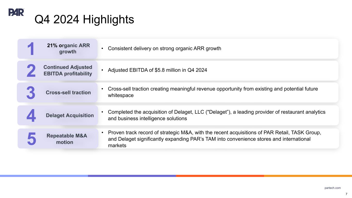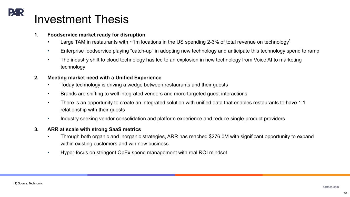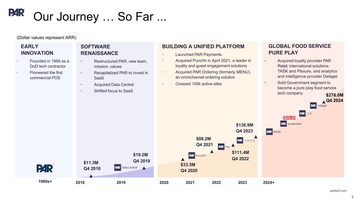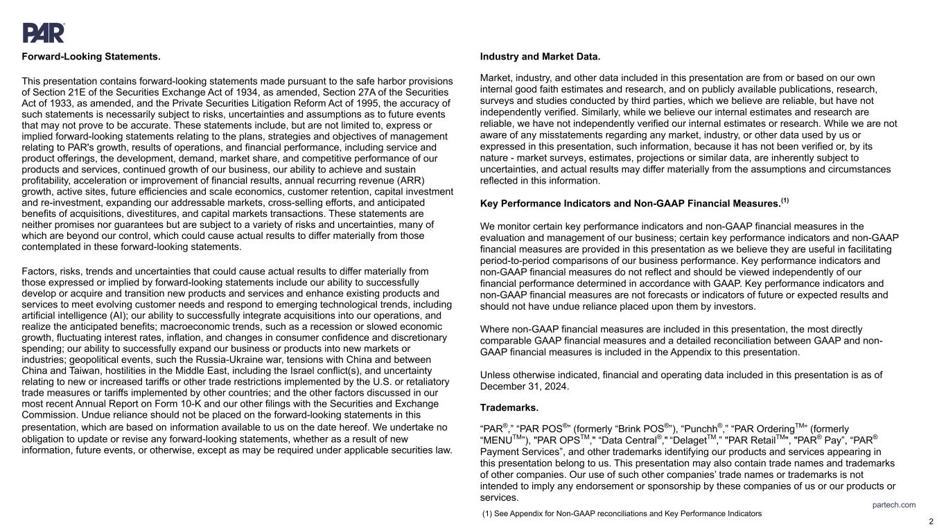 partech.com Forward-Looking Statements. This presentation contains forward-looking statements made pursuant to the safe harbor provisions of Section 21E of the Securities Exchange Act of 1934, as amended, Section 27A of the Securities Act of 1933, as amended, and the Private Securities Litigation Reform Act of 1995, the accuracy of such statements is necessarily subject to risks, uncertainties and assumptions as to future events that may not prove to be accurate. These statements include, but are not limited to, express or implied forward-looking statements relating to the plans, strategies and objectives of management relating to PAR's growth, results of operations, and financial performance, including service and product offerings, the development, demand, market share, and competitive performance of our products and services, continued growth of our business, our ability to achieve and sustain profitability, acceleration or improvement of financial results, annual recurring revenue (ARR) growth, active sites, future efficiencies and scale economics, customer retention, capital investment and re-investment, expanding our addressable markets, cross-selling efforts, and anticipated benefits of acquisitions, divestitures, and capital markets transactions. These statements are neither promises nor guarantees but are subject to a variety of risks and uncertainties, many of which are beyond our control, which could cause actual results to differ materially from those contemplated in these forward-looking statements. Factors, risks, trends and uncertainties that could cause actual results to differ materially from those expressed or implied by forward-looking statements include our ability to successfully develop or acquire and transition new products and services and enhance existing products and services to meet evolving customer needs and respond to emerging technological trends, including artificial intelligence (AI); our ability to successfully integrate acquisitions into our operations, and realize the anticipated benefits; macroeconomic trends, such as a recession or slowed economic growth, fluctuating interest rates, inflation, and changes in consumer confidence and discretionary spending; our ability to successfully expand our business or products into new markets or industries; geopolitical events, such the Russia-Ukraine war, tensions with China and between China and Taiwan, hostilities in the Middle East, including the Israel conflict(s), and uncertainty relating to new or increased tariffs or other trade restrictions implemented by the U.S. or retaliatory trade measures or tariffs implemented by other countries; and the other factors discussed in our most recent Annual Report on Form 10-K and our other filings with the Securities and Exchange Commission. Undue reliance should not be placed on the forward-looking statements in this presentation, which are based on information available to us on the date hereof. We undertake no obligation to update or revise any forward-looking statements, whether as a result of new information, future events, or otherwise, except as may be required under applicable securities law. Industry and Market Data. Market, industry, and other data included in this presentation are from or based on our own internal good faith estimates and research, and on publicly available publications, research, surveys and studies conducted by third parties, which we believe are reliable, but have not independently verified. Similarly, while we believe our internal estimates and research are reliable, we have not independently verified our internal estimates or research. While we are not aware of any misstatements regarding any market, industry, or other data used by us or expressed in this presentation, such information, because it has not been verified or, by its nature - market surveys, estimates, projections or similar data, are inherently subject to uncertainties, and actual results may differ materially from the assumptions and circumstances reflected in this information. Key Performance Indicators and Non-GAAP Financial Measures.(1) We monitor certain key performance indicators and non-GAAP financial measures in the evaluation and management of our business; certain key performance indicators and non-GAAP financial measures are provided in this presentation as we believe they are useful in facilitating period-to-period comparisons of our business performance. Key performance indicators and non-GAAP financial measures do not reflect and should be viewed independently of our financial performance determined in accordance with GAAP. Key performance indicators and non-GAAP financial measures are not forecasts or indicators of future or expected results and should not have undue reliance placed upon them by investors. Where non-GAAP financial measures are included in this presentation, the most directly comparable GAAP financial measures and a detailed reconciliation between GAAP and non- GAAP financial measures is included in the Appendix to this presentation. Unless otherwise indicated, financial and operating data included in this presentation is as of December 31, 2024. Trademarks. “PAR®,” “PAR POS®” (formerly “Brink POS®”), “Punchh®,” “PAR OrderingTM” (formerly “MENUTM”), "PAR OPSTM," “Data Central®," “DelagetTM,” "PAR RetailTM", "PAR® Pay”, “PAR® Payment Services”, and other trademarks identifying our products and services appearing in this presentation belong to us. This presentation may also contain trade names and trademarks of other companies. Our use of such other companies’ trade names or trademarks is not intended to imply any endorsement or sponsorship by these companies of us or our products or services. (1) See Appendix for Non-GAAP reconciliations and Key Performance Indicators 2