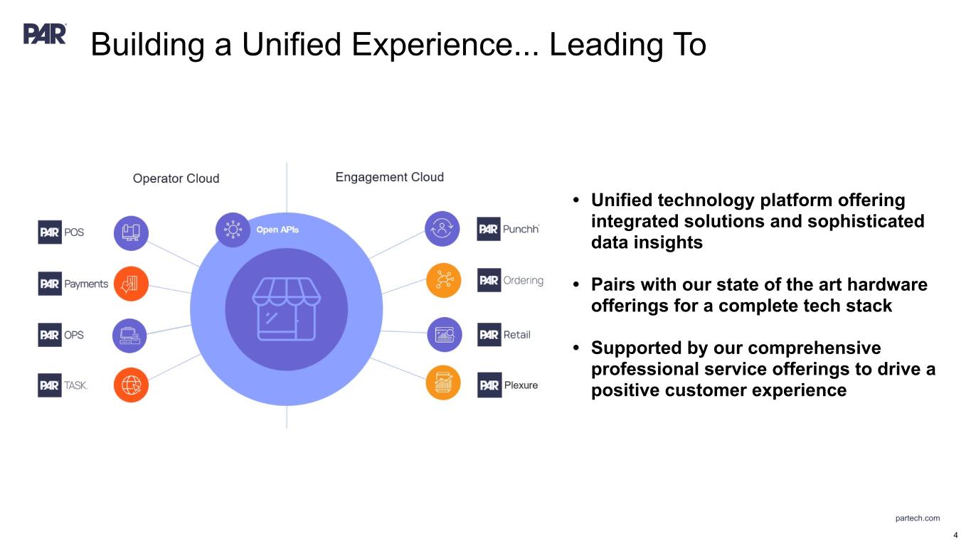 partech.com Our Journey … So Far ... 3 GLOBAL FOOD SERVICE PURE PLAY • Acquired loyalty provider PAR Retail, international solutions TASK and Plexure, and analytics and intelligence provider Delaget • Sold Government segment to become a pure play food service tech company 1980s+ EARLY INNOVATION • Founded in 1968 as a DoD tech contractor • Pioneered the first commercial POS 2018 2019 SOFTWARE RENAISSANCE • Restructured PAR, new team, mission, values • Recapitalized PAR to invest in SaaS • Acquired Data Central • Shifted focus to SaaS $11.3M Q4 2018 ▲ 2020 2021 2022 BUILDING A UNIFIED PLATFORM • Launched PAR Payments • Acquired Punchh in April 2021, a leader in loyalty and guest engagement solutions • Acquired PAR Ordering (formerly MENU), an omnichannel ordering solution • Crossed 100k active sites ▲ $33.5M Q4 2020 2023 2024+ $19.2M Q4 2019 ▲ $136.9M Q4 2023 ▲$88.2M Q4 2021 ▲ ▲ $111.4M Q4 2022 ▲ $276.0M Q4 2024 (Dollar values represent ARR)
