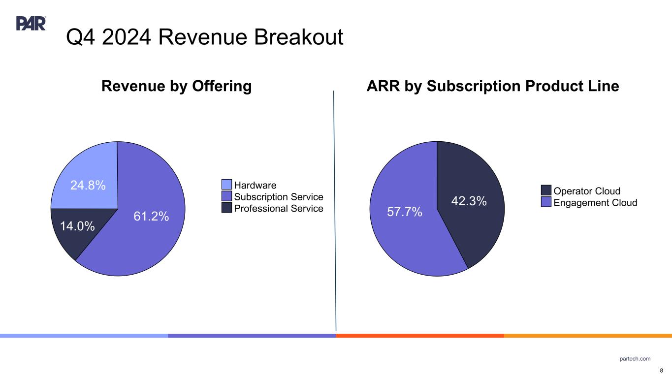 partech.com Q4 2024 Highlights 7 • Consistent delivery on strong organic ARR growth 21% organic ARR growth1 2 • Cross-sell traction creating meaningful revenue opportunity from existing and potential future whitespace Continued Adjusted EBITDA profitability 3 Cross-sell traction 4 Delaget Acquisition • Adjusted EBITDA of $5.8 million in Q4 2024 • Completed the acquisition of Delaget, LLC ("Delaget”), a leading provider of restaurant analytics and business intelligence solutions • Proven track record of strategic M&A, with the recent acquisitions of PAR Retail, TASK Group, and Delaget significantly expanding PAR’s TAM into convenience stores and international markets5 Repeatable M&A motion