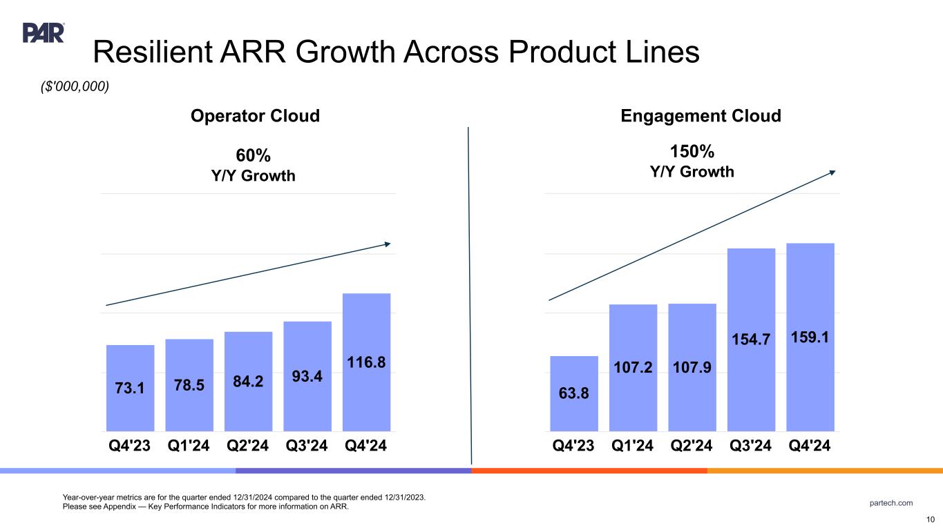 partech.com Resilient ARR Growth Across Product Lines Year-over-year metrics are for the quarter ended 12/31/2024 compared to the quarter ended 12/31/2023. Please see Appendix — Key Performance Indicators for more information on ARR. 73.1 78.5 84.2 93.4 116.8 Q4'23 Q1'24 Q2'24 Q3'24 Q4'24 63.8 107.2 107.9 154.7 159.1 Q4'23 Q1'24 Q2'24 Q3'24 Q4'24 10 Operator Cloud 60% Y/Y Growth Engagement Cloud 150% Y/Y Growth ($'000,000)