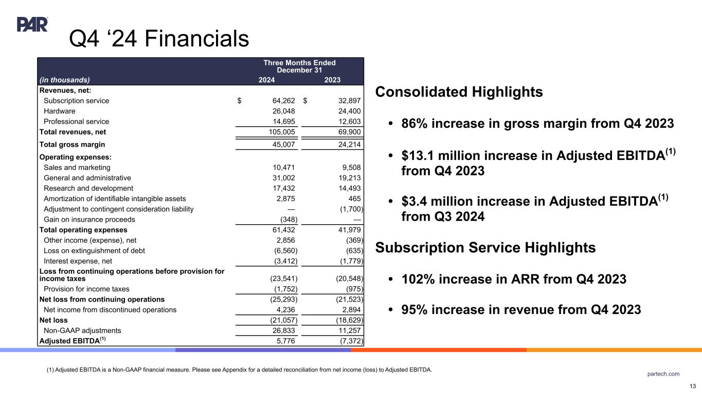 partech.com Q4 ‘24 Financials Consolidated Highlights • 86% increase in gross margin from Q4 2023 • $13.1 million increase in Adjusted EBITDA(1) from Q4 2023 • $3.4 million increase in Adjusted EBITDA(1) from Q3 2024 Subscription Service Highlights • 102% increase in ARR from Q4 2023 • 95% increase in revenue from Q4 2023 Three Months Ended December 31 (in thousands) 2024 2023 Revenues, net: Subscription service $ 64,262 $ 32,897 Hardware 26,048 24,400 Professional service 14,695 12,603 Total revenues, net 105,005 69,900 Total gross margin 45,007 24,214 Operating expenses: Sales and marketing 10,471 9,508 General and administrative 31,002 19,213 Research and development 17,432 14,493 Amortization of identifiable intangible assets 2,875 465 Adjustment to contingent consideration liability — (1,700) Gain on insurance proceeds (348) — Total operating expenses 61,432 41,979 Other income (expense), net 2,856 (369) Loss on extinguishment of debt (6,560) (635) Interest expense, net (3,412) (1,779) Loss from continuing operations before provision for income taxes (23,541) (20,548) Provision for income taxes (1,752) (975) Net loss from continuing operations (25,293) (21,523) Net income from discontinued operations 4,236 2,894 Net loss (21,057) (18,629) Non-GAAP adjustments 26,833 11,257 Adjusted EBITDA(1) 5,776 (7,372) 13 (1) Adjusted EBITDA is a Non-GAAP financial measure. Please see Appendix for a detailed reconciliation from net income (loss) to Adjusted EBITDA.