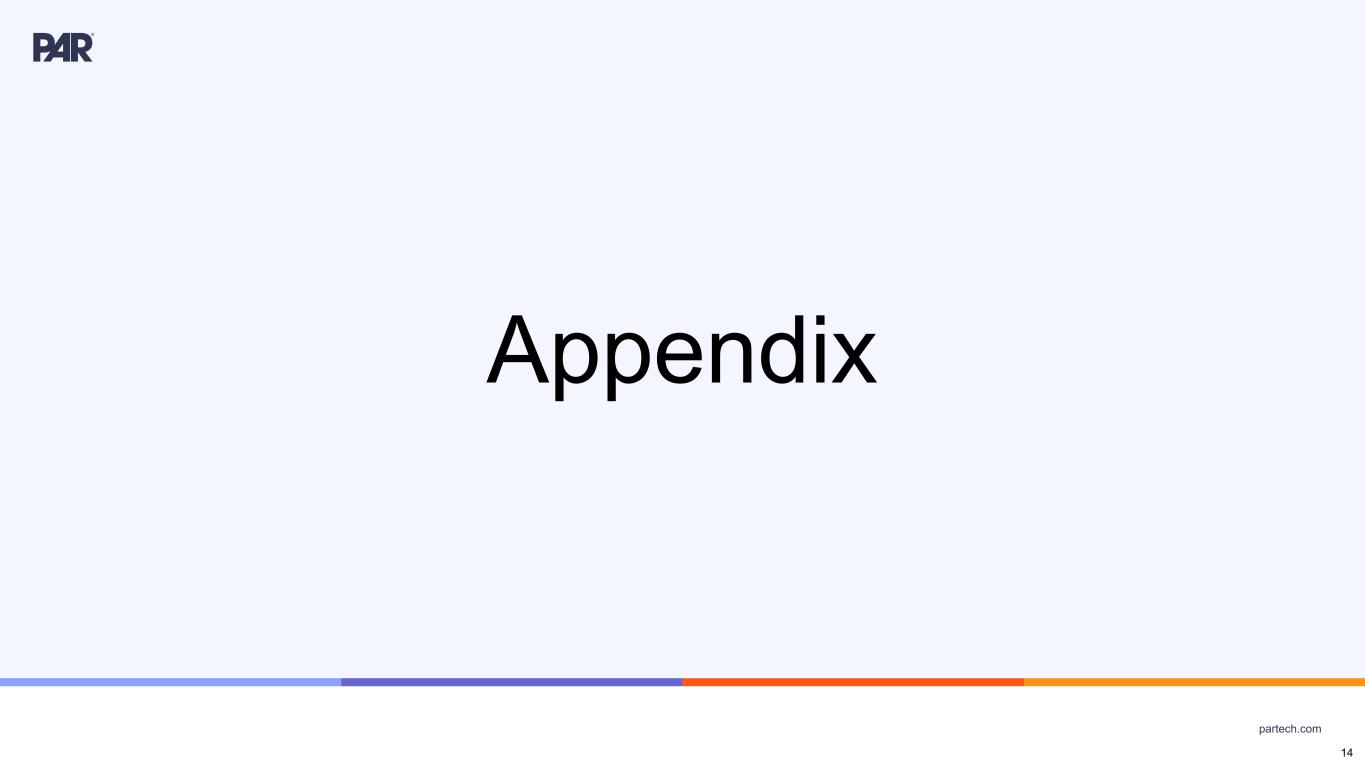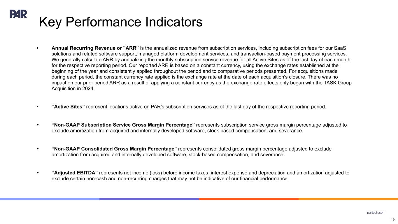 partech.com • Annual Recurring Revenue or "ARR” is the annualized revenue from subscription services, including subscription fees for our SaaS solutions and related software support, managed platform development services, and transaction-based payment processing services. We generally calculate ARR by annualizing the monthly subscription service revenue for all Active Sites as of the last day of each month for the respective reporting period. Our reported ARR is based on a constant currency, using the exchange rates established at the beginning of the year and consistently applied throughout the period and to comparative periods presented. For acquisitions made during each period, the constant currency rate applied is the exchange rate at the date of each acquisition's closure. There was no impact on our prior period ARR as a result of applying a constant currency as the exchange rate effects only began with the TASK Group Acquisition in 2024. • “Active Sites” represent locations active on PAR’s subscription services as of the last day of the respective reporting period. • “Non-GAAP Subscription Service Gross Margin Percentage” represents subscription service gross margin percentage adjusted to exclude amortization from acquired and internally developed software, stock-based compensation, and severance. • “Non-GAAP Consolidated Gross Margin Percentage” represents consolidated gross margin percentage adjusted to exclude amortization from acquired and internally developed software, stock-based compensation, and severance. • “Adjusted EBITDA” represents net income (loss) before income taxes, interest expense and depreciation and amortization adjusted to exclude certain non-cash and non-recurring charges that may not be indicative of our financial performance Key Performance Indicators 19