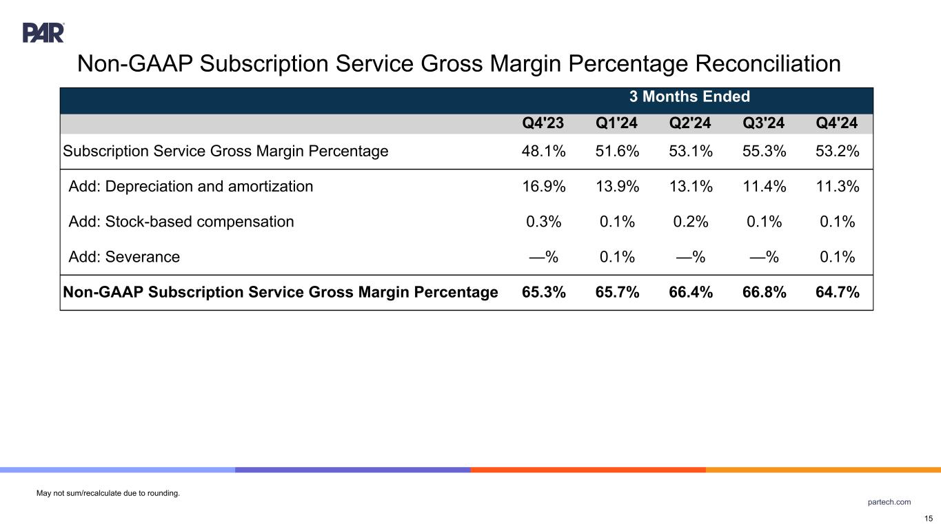 partech.com 3 Months Ended Q4'23 Q1'24 Q2'24 Q3'24 Q4'24 Subscription Service Gross Margin Percentage 48.1% 51.6% 53.1% 55.3% 53.2% Add: Depreciation and amortization 16.9% 13.9% 13.1% 11.4% 11.3% Add: Stock-based compensation 0.3% 0.1% 0.2% 0.1% 0.1% Add: Severance —% 0.1% —% —% 0.1% Non-GAAP Subscription Service Gross Margin Percentage 65.3% 65.7% 66.4% 66.8% 64.7% May not sum/recalculate due to rounding. Non-GAAP Subscription Service Gross Margin Percentage Reconciliation 15