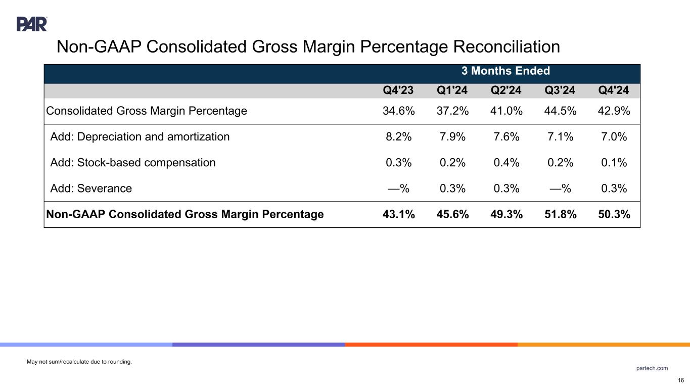 partech.com 3 Months Ended Q4'23 Q1'24 Q2'24 Q3'24 Q4'24 Consolidated Gross Margin Percentage 34.6% 37.2% 41.0% 44.5% 42.9% Add: Depreciation and amortization 8.2% 7.9% 7.6% 7.1% 7.0% Add: Stock-based compensation 0.3% 0.2% 0.4% 0.2% 0.1% Add: Severance —% 0.3% 0.3% —% 0.3% Non-GAAP Consolidated Gross Margin Percentage 43.1% 45.6% 49.3% 51.8% 50.3% May not sum/recalculate due to rounding. Non-GAAP Consolidated Gross Margin Percentage Reconciliation 16