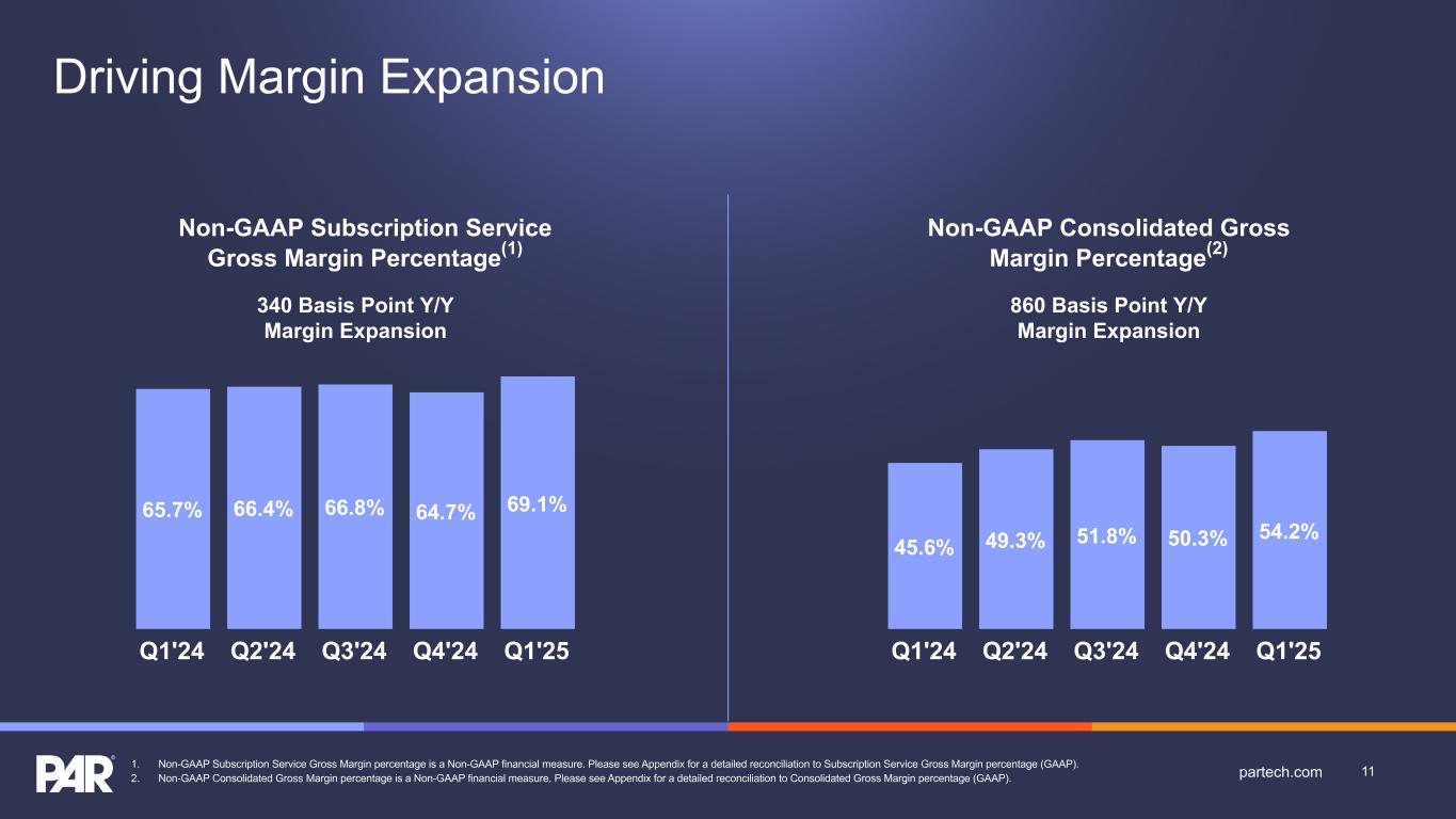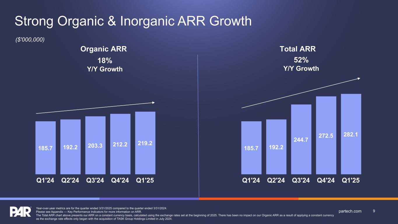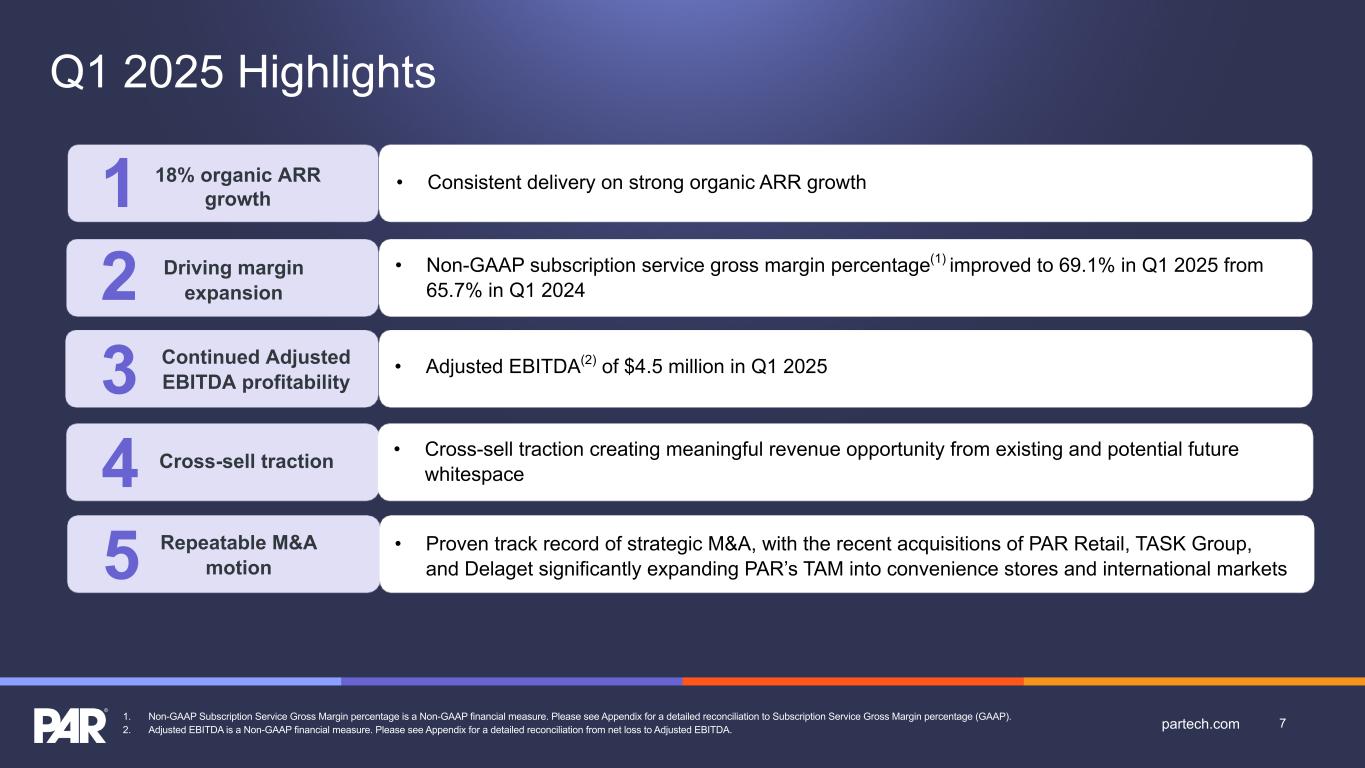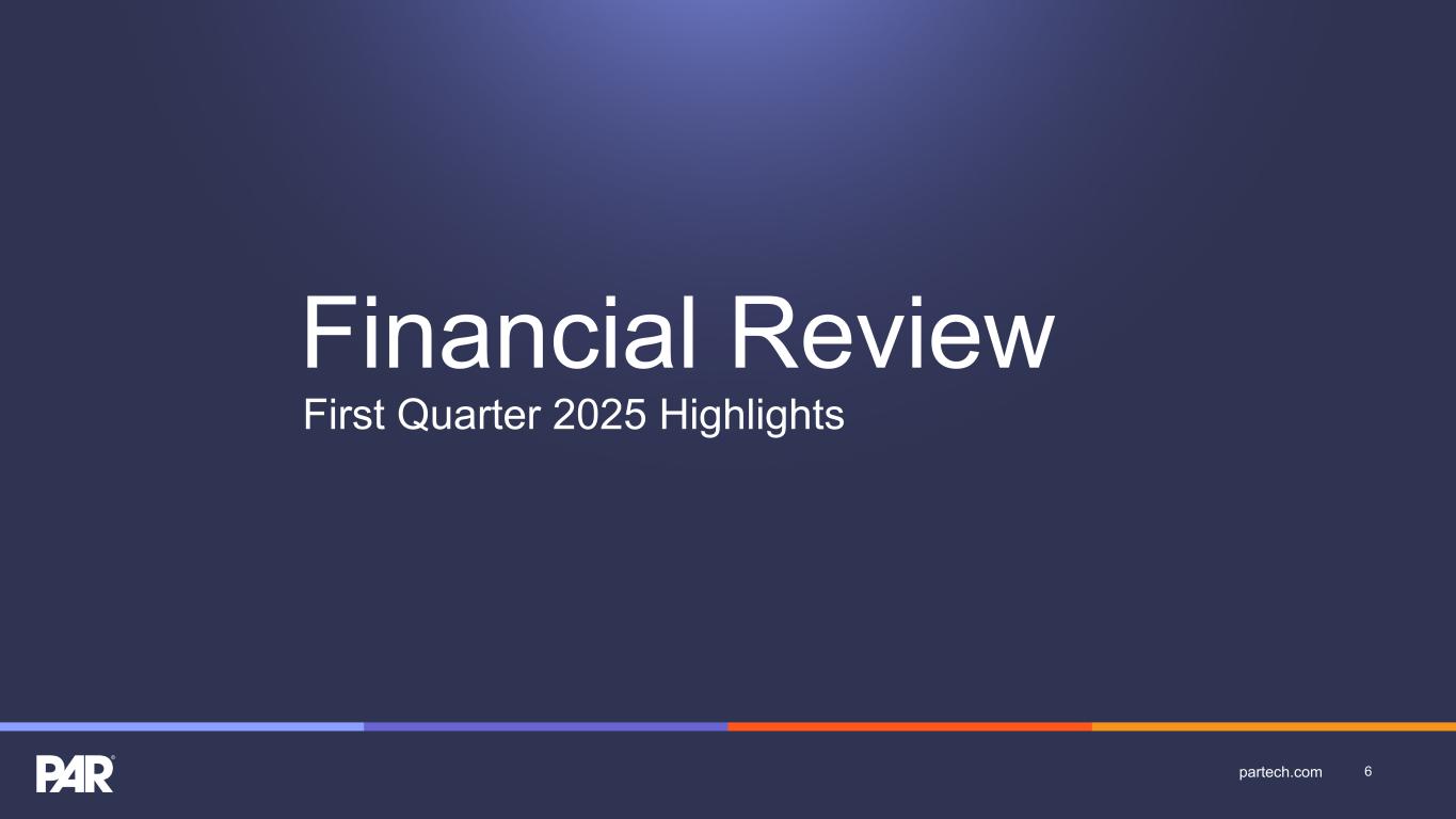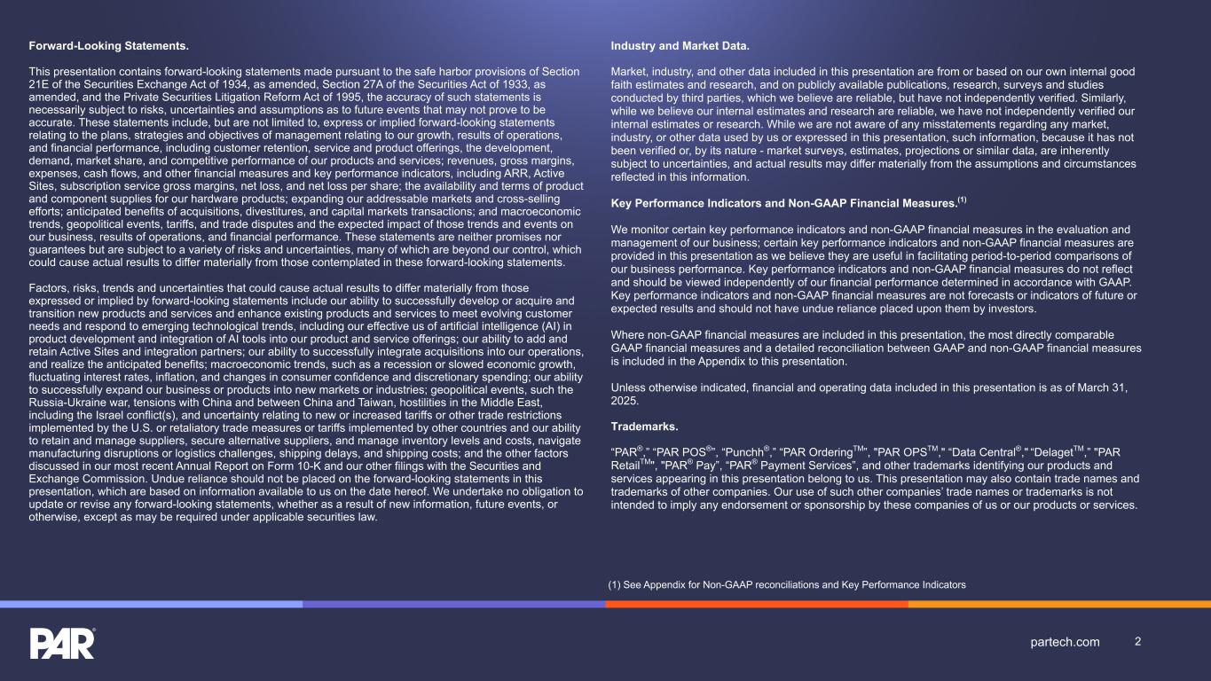 Forward-Looking Statements. This presentation contains forward-looking statements made pursuant to the safe harbor provisions of Section 21E of the Securities Exchange Act of 1934, as amended, Section 27A of the Securities Act of 1933, as amended, and the Private Securities Litigation Reform Act of 1995, the accuracy of such statements is necessarily subject to risks, uncertainties and assumptions as to future events that may not prove to be accurate. These statements include, but are not limited to, express or implied forward-looking statements relating to the plans, strategies and objectives of management relating to our growth, results of operations, and financial performance, including customer retention, service and product offerings, the development, demand, market share, and competitive performance of our products and services; revenues, gross margins, expenses, cash flows, and other financial measures and key performance indicators, including ARR, Active Sites, subscription service gross margins, net loss, and net loss per share; the availability and terms of product and component supplies for our hardware products; expanding our addressable markets and cross-selling efforts; anticipated benefits of acquisitions, divestitures, and capital markets transactions; and macroeconomic trends, geopolitical events, tariffs, and trade disputes and the expected impact of those trends and events on our business, results of operations, and financial performance. These statements are neither promises nor guarantees but are subject to a variety of risks and uncertainties, many of which are beyond our control, which could cause actual results to differ materially from those contemplated in these forward-looking statements. Factors, risks, trends and uncertainties that could cause actual results to differ materially from those expressed or implied by forward-looking statements include our ability to successfully develop or acquire and transition new products and services and enhance existing products and services to meet evolving customer needs and respond to emerging technological trends, including our effective us of artificial intelligence (AI) in product development and integration of AI tools into our product and service offerings; our ability to add and retain Active Sites and integration partners; our ability to successfully integrate acquisitions into our operations, and realize the anticipated benefits; macroeconomic trends, such as a recession or slowed economic growth, fluctuating interest rates, inflation, and changes in consumer confidence and discretionary spending; our ability to successfully expand our business or products into new markets or industries; geopolitical events, such the Russia-Ukraine war, tensions with China and between China and Taiwan, hostilities in the Middle East, including the Israel conflict(s), and uncertainty relating to new or increased tariffs or other trade restrictions implemented by the U.S. or retaliatory trade measures or tariffs implemented by other countries and our ability to retain and manage suppliers, secure alternative suppliers, and manage inventory levels and costs, navigate manufacturing disruptions or logistics challenges, shipping delays, and shipping costs; and the other factors discussed in our most recent Annual Report on Form 10-K and our other filings with the Securities and Exchange Commission. Undue reliance should not be placed on the forward-looking statements in this presentation, which are based on information available to us on the date hereof. We undertake no obligation to update or revise any forward-looking statements, whether as a result of new information, future events, or otherwise, except as may be required under applicable securities law. Industry and Market Data. Market, industry, and other data included in this presentation are from or based on our own internal good faith estimates and research, and on publicly available publications, research, surveys and studies conducted by third parties, which we believe are reliable, but have not independently verified. Similarly, while we believe our internal estimates and research are reliable, we have not independently verified our internal estimates or research. While we are not aware of any misstatements regarding any market, industry, or other data used by us or expressed in this presentation, such information, because it has not been verified or, by its nature - market surveys, estimates, projections or similar data, are inherently subject to uncertainties, and actual results may differ materially from the assumptions and circumstances reflected in this information. Key Performance Indicators and Non-GAAP Financial Measures.(1) We monitor certain key performance indicators and non-GAAP financial measures in the evaluation and management of our business; certain key performance indicators and non-GAAP financial measures are provided in this presentation as we believe they are useful in facilitating period-to-period comparisons of our business performance. Key performance indicators and non-GAAP financial measures do not reflect and should be viewed independently of our financial performance determined in accordance with GAAP. Key performance indicators and non-GAAP financial measures are not forecasts or indicators of future or expected results and should not have undue reliance placed upon them by investors. Where non-GAAP financial measures are included in this presentation, the most directly comparable GAAP financial measures and a detailed reconciliation between GAAP and non-GAAP financial measures is included in the Appendix to this presentation. Unless otherwise indicated, financial and operating data included in this presentation is as of March 31, 2025. Trademarks. “PAR®,” “PAR POS®”, “Punchh®,” “PAR OrderingTM”, "PAR OPSTM," “Data Central®," “DelagetTM,” "PAR RetailTM", "PAR® Pay”, “PAR® Payment Services”, and other trademarks id