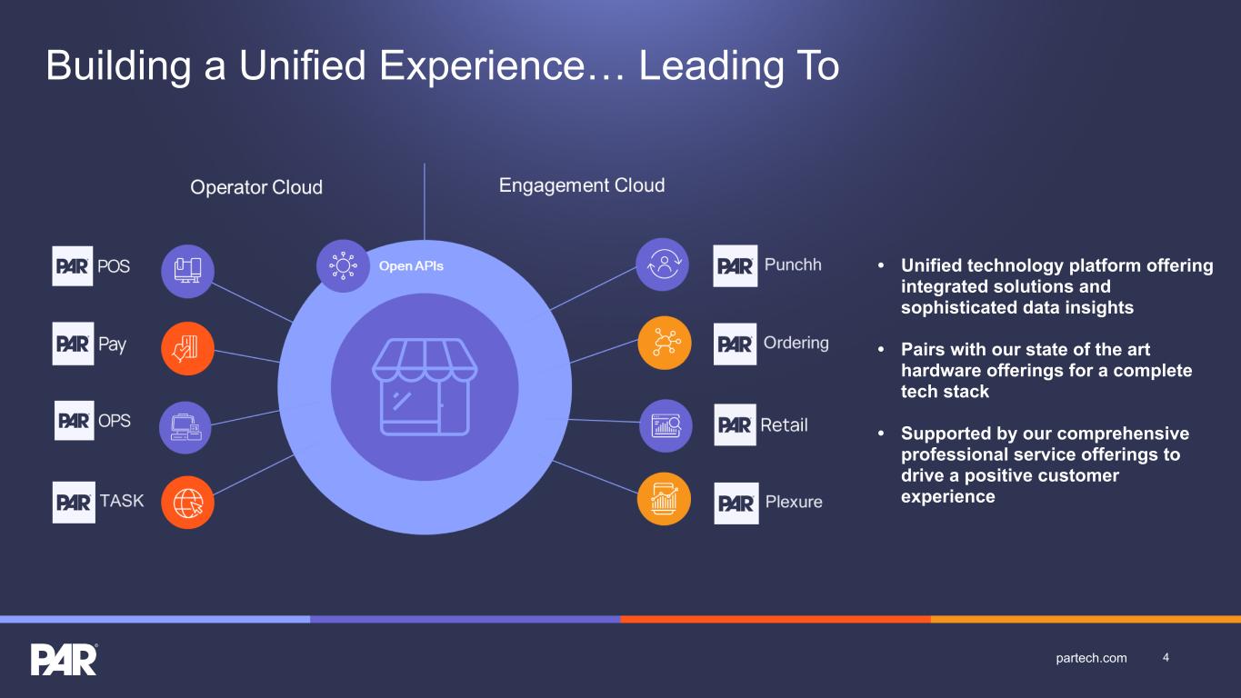 Building a Unified Experience… Leading To • Unified technology platform offering integrated solutions and sophisticated data insights • Pairs with our state of the art hardware offerings for a complete tech stack • Supported by our comprehensive professional service offerings to drive a positive customer experience 4partech.com