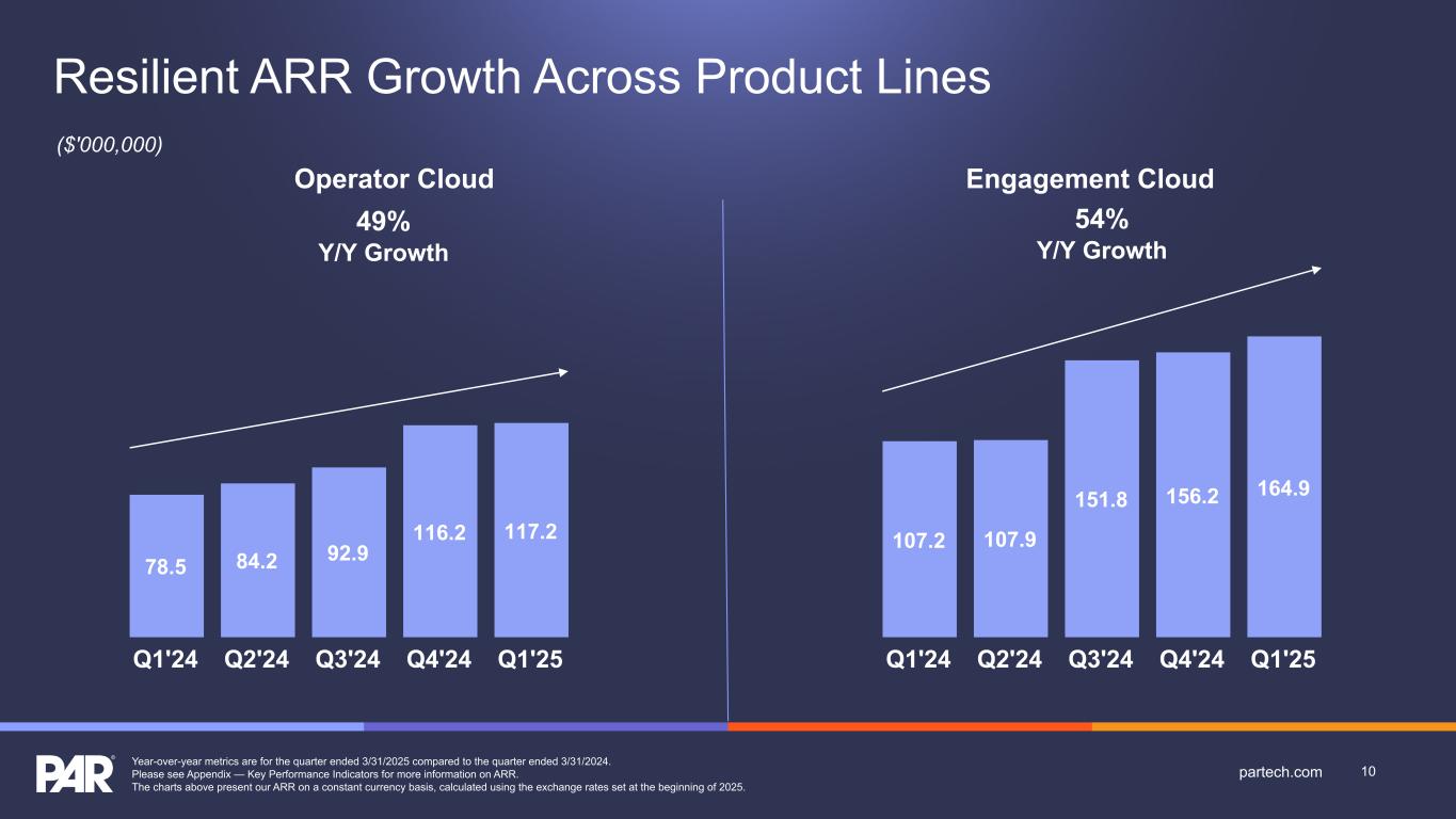 54% Y/Y Growth Year-over-year metrics are for the quarter ended 3/31/2025 compared to the quarter ended 3/31/2024. Please see Appendix — Key Performance Indicators for more information on ARR. The charts above present our ARR on a constant currency basis, calculated using the exchange rates set at the beginning of 2025. 78.5 84.2 92.9 116.2 117.2 Q1'24 Q2'24 Q3'24 Q4'24 Q1'25 ($'000,000) Operator Cloud 49% Y/Y Growth 107.2 107.9 151.8 156.2 164.9 Q1'24 Q2'24 Q3'24 Q4'24 Q1'25 10partech.com Engagement Cloud Resilient ARR Growth Across Product Lines
