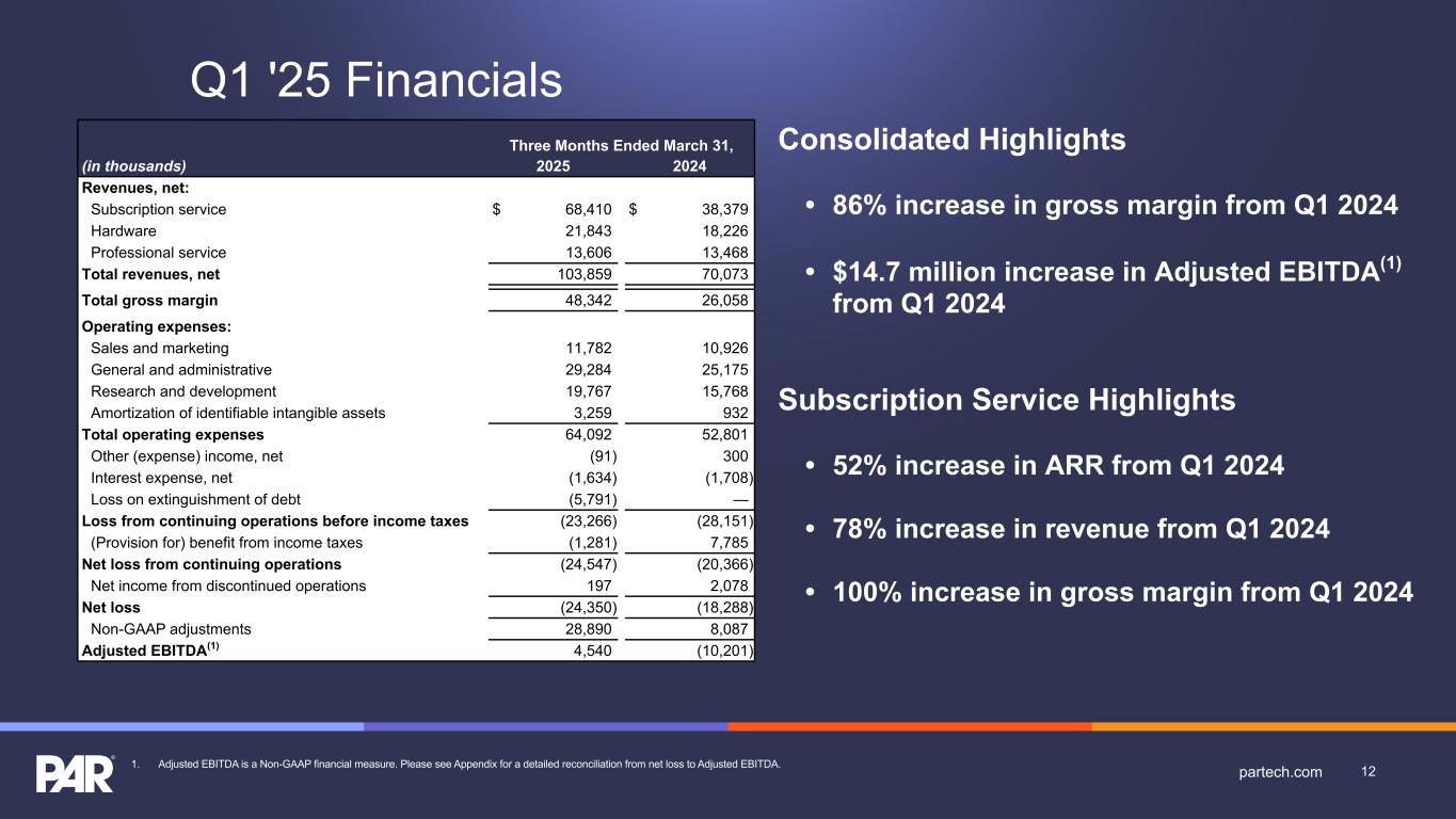 Q1 '25 Financials Consolidated Highlights • 86% increase in gross margin from Q1 2024 • $14.7 million increase in Adjusted EBITDA(1) from Q1 2024 Subscription Service Highlights • 52% increase in ARR from Q1 2024 • 78% increase in revenue from Q1 2024 • 100% increase in gross margin from Q1 2024 Three Months Ended March 31, (in thousands) 2025 2024 Revenues, net: Subscription service $ 68,410 $ 38,379 Hardware 21,843 18,226 Professional service 13,606 13,468 Total revenues, net 103,859 70,073 Total gross margin 48,342 26,058 Operating expenses: Sales and marketing 11,782 10,926 General and administrative 29,284 25,175 Research and development 19,767 15,768 Amortization of identifiable intangible assets 3,259 932 Total operating expenses 64,092 52,801 Other (expense) income, net (91) 300 Interest expense, net (1,634) (1,708) Loss on extinguishment of debt (5,791) — Loss from continuing operations before income taxes (23,266) (28,151) (Provision for) benefit from income taxes (1,281) 7,785 Net loss from continuing operations (24,547) (20,366) Net income from discontinued operations 197 2,078 Net loss (24,350) (18,288) Non-GAAP adjustments 28,890 8,087 Adjusted EBITDA(1) 4,540 (10,201) 12partech.com1. Adjusted EBITDA is a Non-GAAP financial measure. Please see Appendix for a detailed reconciliation from net loss to Adjusted EBITDA.