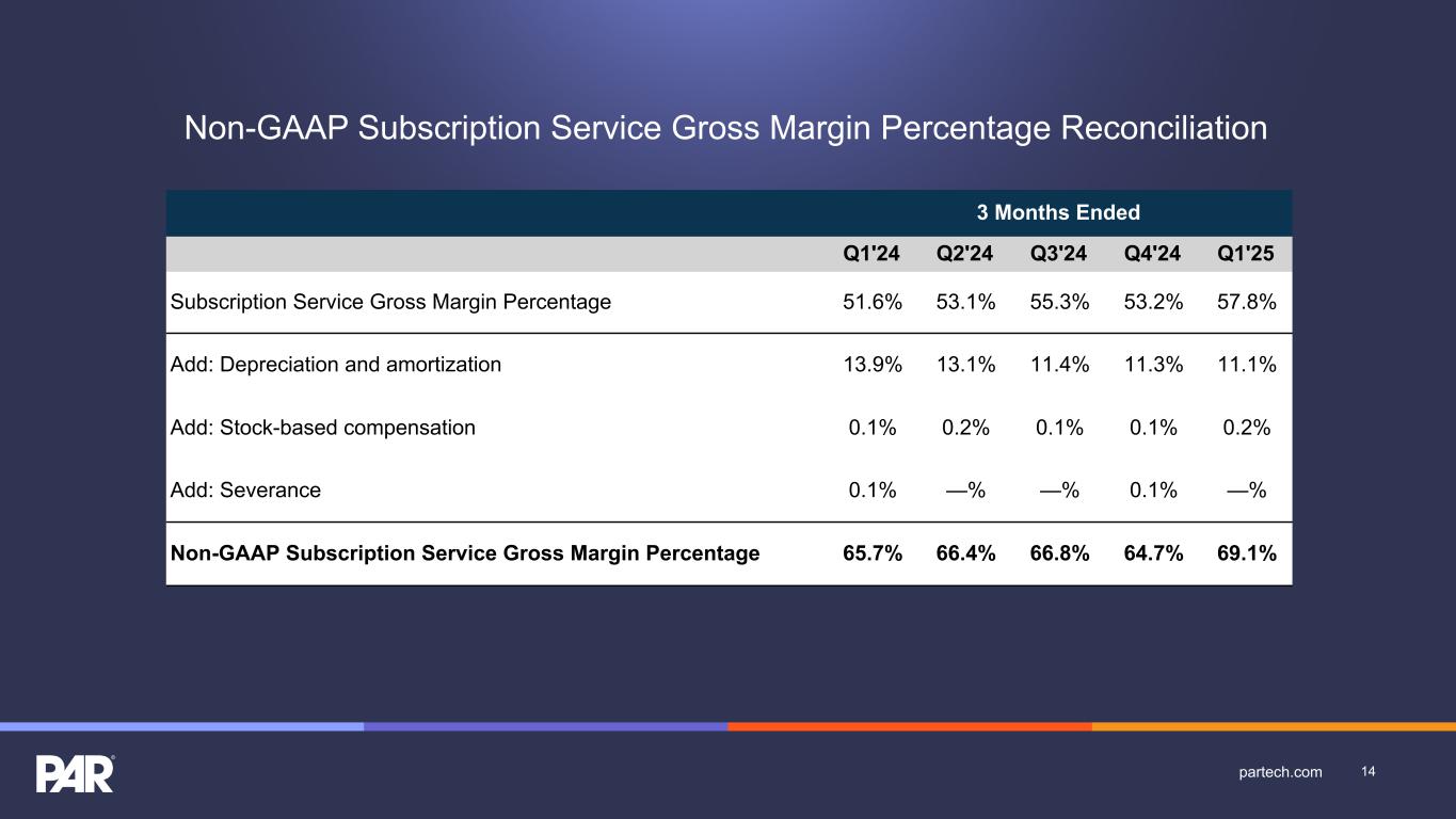 Non-GAAP Subscription Service Gross Margin Percentage Reconciliation 3 Months Ended Q1'24 Q2'24 Q3'24 Q4'24 Q1'25 Subscription Service Gross Margin Percentage 51.6% 53.1% 55.3% 53.2% 57.8% Add: Depreciation and amortization 13.9% 13.1% 11.4% 11.3% 11.1% Add: Stock-based compensation 0.1% 0.2% 0.1% 0.1% 0.2% Add: Severance 0.1% —% —% 0.1% —% Non-GAAP Subscription Service Gross Margin Percentage 65.7% 66.4% 66.8% 64.7% 69.1% 14partech.com