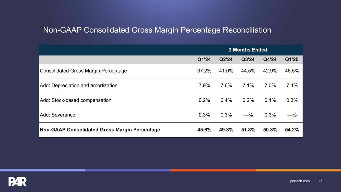 Non-GAAP Consolidated Gross Margin Percentage Reconciliation 3 Months Ended Q1'24 Q2'24 Q3'24 Q4'24 Q1'25 Consolidated Gross Margin Percentage 37.2% 41.0% 44.5% 42.9% 46.5% Add: Depreciation and amortization 7.9% 7.6% 7.1% 7.0% 7.4% Add: Stock-based compensation 0.2% 0.4% 0.2% 0.1% 0.3% Add: Severance 0.3% 0.3% —% 0.3% —% Non-GAAP Consolidated Gross Margin Percentage 45.6% 49.3% 51.8% 50.3% 54.2% 15partech.com