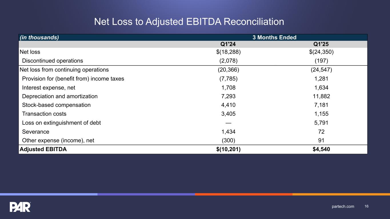 (in thousands) 3 Months Ended Q1'24 Q1'25 Net loss $(18,288) $(24,350) Discontinued operations (2,078) (197) Net loss from continuing operations (20,366) (24,547) Provision for (benefit from) income taxes (7,785) 1,281 Interest expense, net 1,708 1,634 Depreciation and amortization 7,293 11,882 Stock-based compensation 4,410 7,181 Transaction costs 3,405 1,155 Loss on extinguishment of debt — 5,791 Severance 1,434 72 Other expense (income), net (300) 91 Adjusted EBITDA $(10,201) $4,540 Net Loss to Adjusted EBITDA Reconciliation 16partech.com