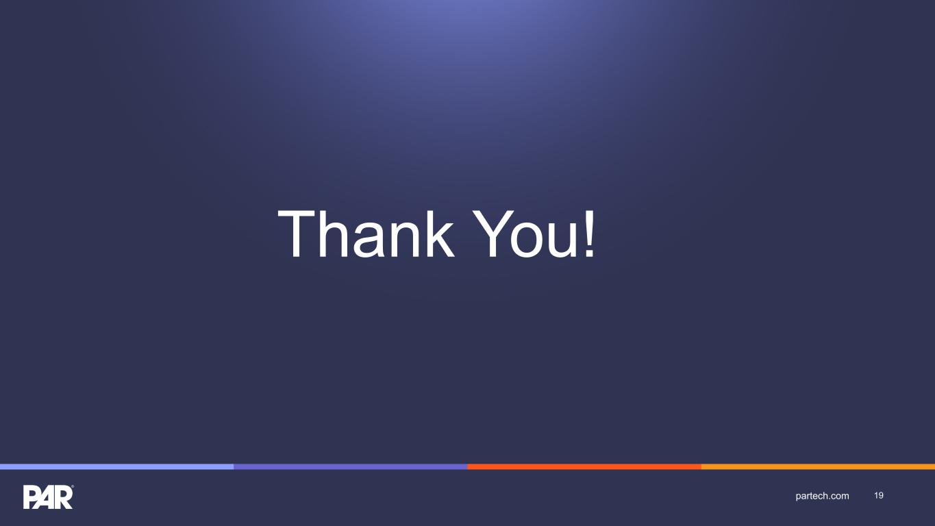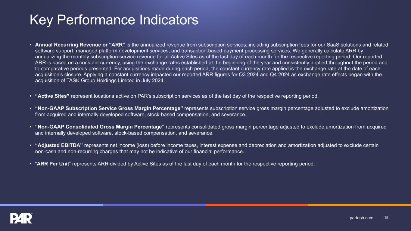 Key Performance Indicators • Annual Recurring Revenue or "ARR” is the annualized revenue from subscription services, including subscription fees for our SaaS solutions and related software support, managed platform development services, and transaction-based payment processing services. We generally calculate ARR by annualizing the monthly subscription service revenue for all Active Sites as of the last day of each month for the respective reporting period. Our reported ARR is based on a constant currency, using the exchange rates established at the beginning of the year and consistently applied throughout the period and to comparative periods presented. For acquisitions made during each period, the constant currency rate applied is the exchange rate at the date of each acquisition's closure. Applying a constant currency impacted our reported ARR figures for Q3 2024 and Q4 2024 as exchange rate effects began with the acquisition of TASK Group Holdings Limited in July 2024. • “Active Sites” represent locations active on PAR’s subscription services as of the last day of the respective reporting period. • “Non-GAAP Subscription Service Gross Margin Percentage” represents subscription service gross margin percentage adjusted to exclude amortization from acquired and internally developed software, stock-based compensation, and severance. • “Non-GAAP Consolidated Gross Margin Percentage” represents consolidated gross margin percentage adjusted to exclude amortization from acquired and internally developed software, stock-based compensation, and severance. • “Adjusted EBITDA” represents net income (loss) before income taxes, interest expense and depreciation and amortization adjusted to exclude certain non-cash and non-recurring charges that may not be indicative of our financial performance. • “ARR Per Unit” represents ARR divided by Active Sites as of the last day of each month for the respective reporting period. 18partech.com