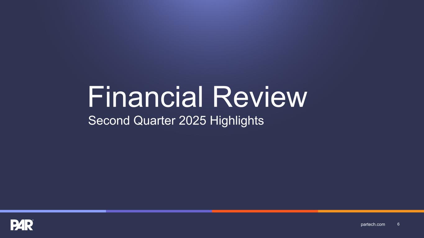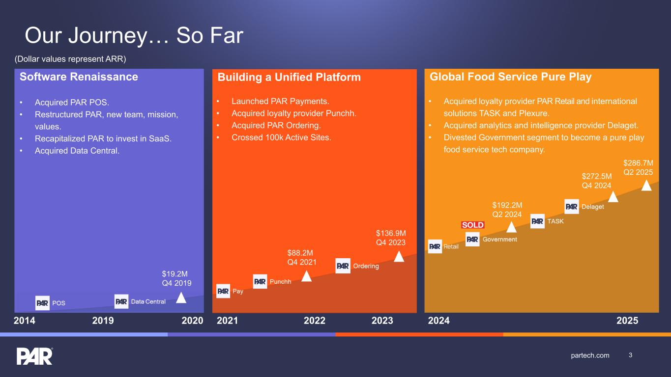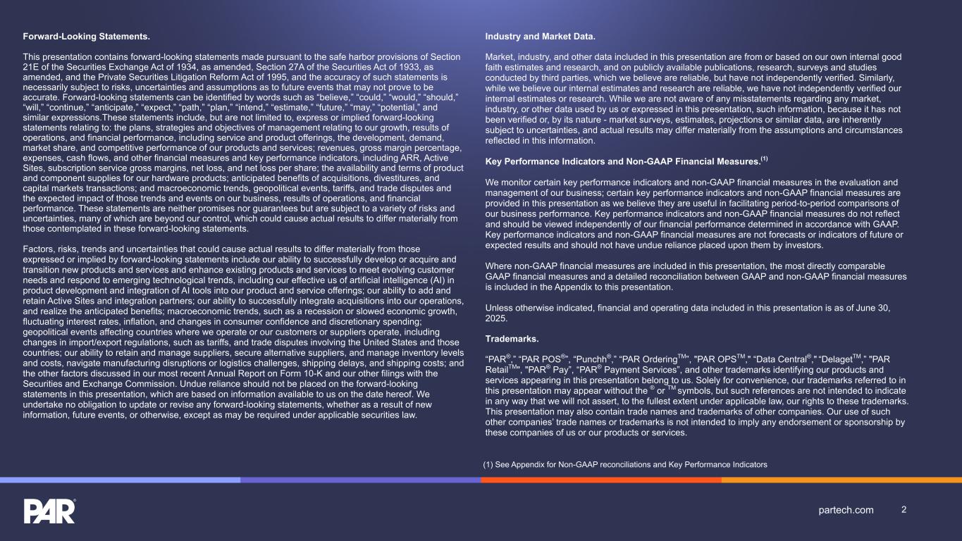 Forward-Looking Statements. This presentation contains forward-looking statements made pursuant to the safe harbor provisions of Section 21E of the Securities Exchange Act of 1934, as amended, Section 27A of the Securities Act of 1933, as amended, and the Private Securities Litigation Reform Act of 1995, and the accuracy of such statements is necessarily subject to risks, uncertainties and assumptions as to future events that may not prove to be accurate. Forward-looking statements can be identified by words such as “believe,” “could,” “would,” “should,” “will,” “continue,” “anticipate,” “expect,” “path,” “plan,” “intend,” “estimate,” “future,” “may,” “potential,” and similar expressions.These statements include, but are not limited to, express or implied forward-looking statements relating to: the plans, strategies and objectives of management relating to our growth, results of operations, and financial performance, including service and product offerings, the development, demand, market share, and competitive performance of our products and services; revenues, gross margin percentage, expenses, cash flows, and other financial measures and key performance indicators, including ARR, Active Sites, subscription service gross margins, net loss, and net loss per share; the availability and terms of product and component supplies for our hardware products; anticipated benefits of acquisitions, divestitures, and capital markets transactions; and macroeconomic trends, geopolitical events, tariffs, and trade disputes and the expected impact of those trends and events on our business, results of operations, and financial performance. These statements are neither promises nor guarantees but are subject to a variety of risks and uncertainties, many of which are beyond our control, which could cause actual results to differ materially from those contemplated in these forward-looking statements. Factors, risks, trends and uncertainties that could cause actual results to differ materially from those expressed or implied by forward-looking statements include our ability to successfully develop or acquire and transition new products and services and enhance existing products and services to meet evolving customer needs and respond to emerging technological trends, including our effective us of artificial intelligence (AI) in product development and integration of AI tools into our product and service offerings; our ability to add and retain Active Sites and integration partners; our ability to successfully integrate acquisitions into our operations, and realize the anticipated benefits; macroeconomic trends, such as a recession or slowed economic growth, fluctuating interest rates, inflation, and changes in consumer confidence and discretionary spending; geopolitical events affecting countries where we operate or our customers or suppliers operate, including changes in import/export regulations, such as tariffs, and trade disputes involving the United States and those countries; our ability to retain and manage suppliers, secure alternative suppliers, and manage inventory levels and costs, navigate manufacturing disruptions or logistics challenges, shipping delays, and shipping costs; and the other factors discussed in our most recent Annual Report on Form 10-K and our other filings with the Securities and Exchange Commission. Undue reliance should not be placed on the forward-looking statements in this presentation, which are based on information available to us on the date hereof. We undertake no obligation to update or revise any forward-looking statements, whether as a result of new information, future events, or otherwise, except as may be required under applicable securities law. Industry and Market Data. Market, industry, and other data included in this presentation are from or based on our own internal good faith estimates and research, and on publicly available publications, research, surveys and studies conducted by third parties, which we believe are reliable, but have not independently verified. Similarly, while we believe our internal estimates and research are reliable, we have not independently verified our internal estimates or research. While we are not aware of any misstatements regarding any market, industry, or other data used by us or expressed in this presentation, such information, because it has not been verified or, by its nature - market surveys, estimates, projections or similar data, are inherently subject to uncertainties, and actual results may differ materially from the assumptions and circumstances reflected in this information. Key Performance Indicators and Non-GAAP Financial Measures.(1) We monitor certain key performance indicators and non-GAAP financial measures in the evaluation and management of our business; certain key performance indicators and non-GAAP financial measures are provided in this presentation as we believe they are useful in facilitating period-to-period comparisons of our business performance. Key performance indicators and non-GAAP financial measures do not reflect and should be viewed independently of our financial performance determined in accordance with GAAP. Key performance indicators and non-GAAP financial measures are not forecasts or indicators of future or expected results and should not have undue reliance placed upon them by investors. Where non-GAAP financial measures are included in this presentation, the most directly comparable GAAP financial measures and a detailed reconciliation between GAAP and non-GAAP financial measures is included in the Appendix to this presentation. Unless otherwise indicated, financial and operating data included in this presentation is as of June 30, 2025. Trademarks. “PAR®,” “PAR POS®”, “Punchh®,” “PAR OrderingTM”, "PAR OPSTM," “Data Central®," “DelagetTM,” "PAR RetailTM", "PAR® Pay”, “PAR® Payment Services”, and