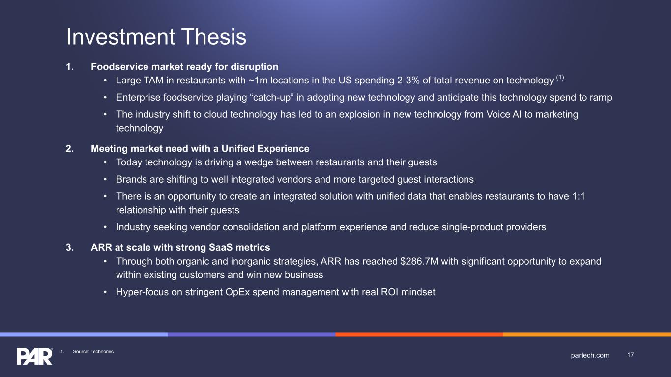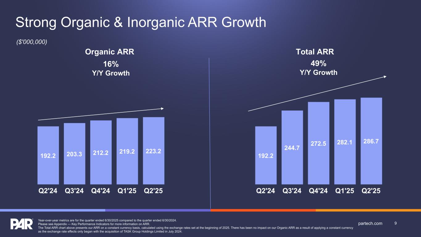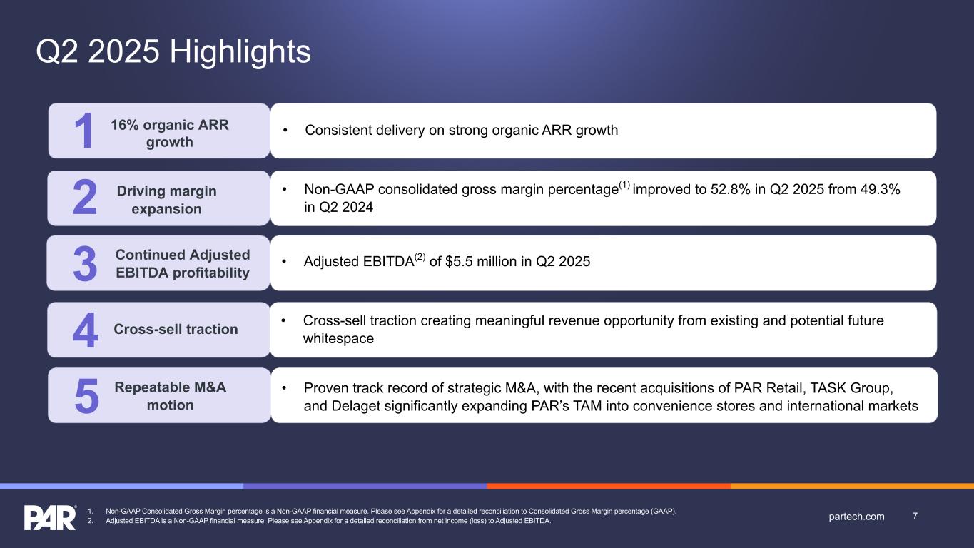 Forward-Looking Statements. This presentation contains forward-looking statements made pursuant to the safe harbor provisions of Section 21E of the Securities Exchange Act of 1934, as amended, Section 27A of the Securities Act of 1933, as amended, and the Private Securities Litigation Reform Act of 1995, and the accuracy of such statements is necessarily subject to risks, uncertainties and assumptions as to future events that may not prove to be accurate. Forward-looking statements can be identified by words such as “believe,” “could,” “would,” “should,” “will,” “continue,” “anticipate,” “expect,” “path,” “plan,” “intend,” “estimate,” “future,” “may,” “potential,” and similar expressions.These statements include, but are not limited to, express or implied forward-looking statements relating to: the plans, strategies and objectives of management relating to our growth, results of operations, and financial performance, including service and product offerings, the development, demand, market share, and competitive performance of our products and services; revenues, gross margin percentage, expenses, cash flows, and other financial measures and key performance indicators, including ARR, Active Sites, subscription service gross margins, net loss, and net loss per share; the availability and terms of product and component supplies for our hardware products; anticipated benefits of acquisitions, divestitures, and capital markets transactions; and macroeconomic trends, geopolitical events, tariffs, and trade disputes and the expected impact of those trends and events on our business, results of operations, and financial performance. These statements are neither promises nor guarantees but are subject to a variety of risks and uncertainties, many of which are beyond our control, which could cause actual results to differ materially from those contemplated in these forward-looking statements. Factors, risks, trends and uncertainties that could cause actual results to differ materially from those expressed or implied by forward-looking statements include our ability to successfully develop or acquire and transition new products and services and enhance existing products and services to meet evolving customer needs and respond to emerging technological trends, including our effective us of artificial intelligence (AI) in product development and integration of AI tools into our product and service offerings; our ability to add and retain Active Sites and integration partners; our ability to successfully integrate acquisitions into our operations, and realize the anticipated benefits; macroeconomic trends, such as a recession or slowed economic growth, fluctuating interest rates, inflation, and changes in consumer confidence and discretionary spending; geopolitical events affecting countries where we operate or our customers or suppliers operate, including changes in import/export regulations, such as tariffs, and trade disputes involving the United States and those countries; our ability to retain and manage suppliers, secure alternative suppliers, and manage inventory levels and costs, navigate manufacturing disruptions or logistics challenges, shipping delays, and shipping costs; and the other factors discussed in our most recent Annual Report on Form 10-K and our other filings with the Securities and Exchange Commission. Undue reliance should not be placed on the forward-looking statements in this presentation, which are based on information available to us on the date hereof. We undertake no obligation to update or revise any forward-looking statements, whether as a result of new information, future events, or otherwise, except as may be required under applicable securities law. Industry and Market Data. Market, industry, and other data included in this presentation are from or based on our own internal good faith estimates and research, and on publicly available publications, research, surveys and studies conducted by third parties, which we believe are reliable, but have not independently verified. Similarly, while we believe our internal estimates and research are reliable, we have not independently verified our internal estimates or research. While we are not aware of any misstatements regarding any market, industry, or other data used by us or expressed in this presentation, such information, because it has not been verified or, by its nature - market surveys, estimates, projections or similar data, are inherently subject to uncertainties, and actual results may differ materially from the assumptions and circumstances reflected in this information. Key Performance Indicators and Non-GAAP Financial Measures.(1) We monitor certain key performance indicators and non-GAAP financial measures in the evaluation and management of our business; certain key performance indicators and non-GAAP financial measures are provided in this presentation as we believe they are useful in facilitating period-to-period comparisons of our business performance. Key performance indicators and non-GAAP financial measures do not reflect and should be viewed independently of our financial performance determined in accordance with GAAP. Key performance indicators and non-GAAP financial measures are not forecasts or indicators of future or expected results and should not have undue reliance placed upon them by investors. Where non-GAAP financial measures are included in this presentation, the most directly comparable GAAP financial measures and a detailed reconciliation between GAAP and non-GAAP financial measures is included in the Appendix to this presentation. Unless otherwise indicated, financial and operating data included in this presentation is as of June 30, 2025. Trademarks. “PAR®,” “PAR POS®”, “Punchh®,” “PAR OrderingTM”, "PAR OPSTM," “Data Central®," “DelagetTM,” "PAR RetailTM", "PAR® Pay”, “PAR® Payment Services”, and