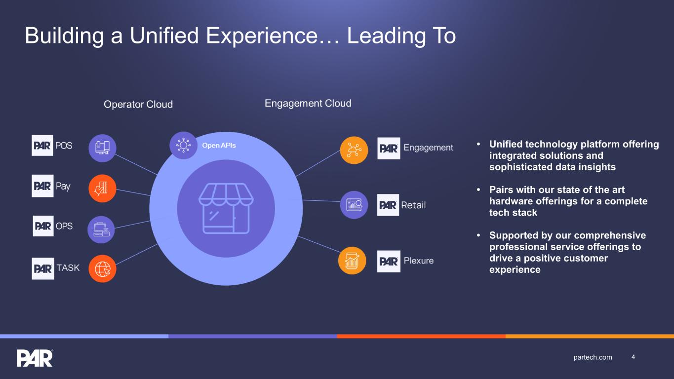 Building a Unified Experience… Leading To • Unified technology platform offering integrated solutions and sophisticated data insights • Pairs with our state of the art hardware offerings for a complete tech stack • Supported by our comprehensive professional service offerings to drive a positive customer experience 4partech.com