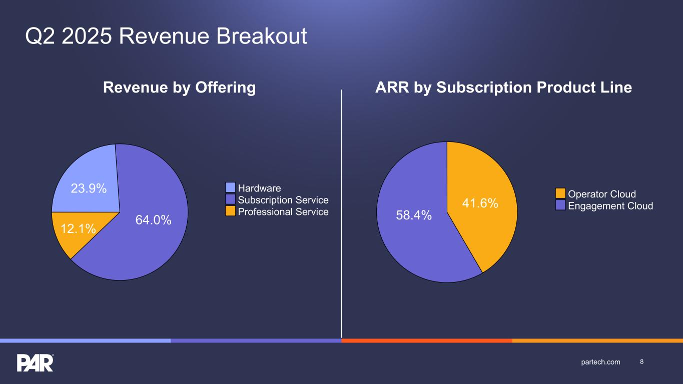 Revenue by Offering 23.9% 64.0% 12.1% Hardware Subscription Service Professional Service ARR by Subscription Product Line 41.6% 58.4% Operator Cloud Engagement Cloud 8partech.com Q2 2025 Revenue Breakout