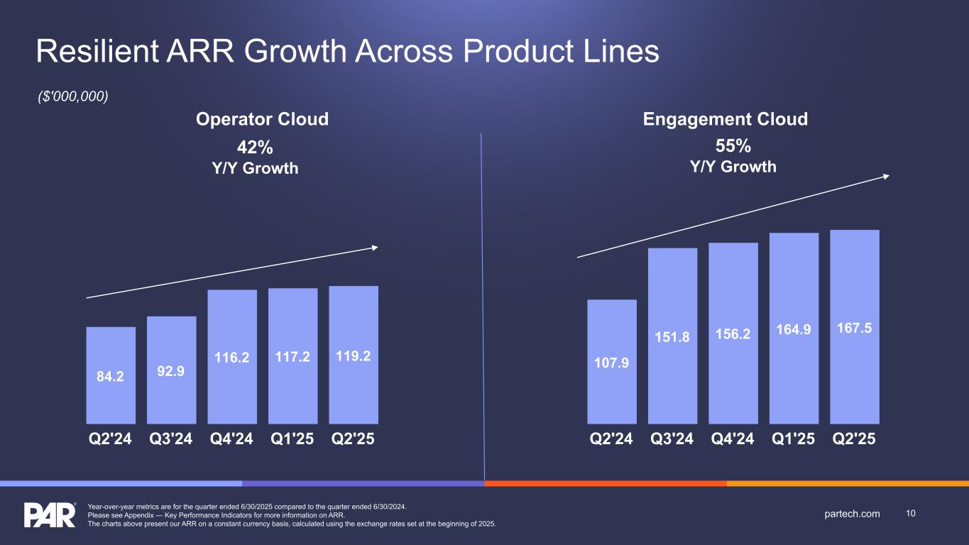 55% Y/Y Growth Year-over-year metrics are for the quarter ended 6/30/2025 compared to the quarter ended 6/30/2024. Please see Appendix — Key Performance Indicators for more information on ARR. The charts above present our ARR on a constant currency basis, calculated using the exchange rates set at the beginning of 2025. 84.2 92.9 116.2 117.2 119.2 Q2'24 Q3'24 Q4'24 Q1'25 Q2'25 ($'000,000) Operator Cloud 42% Y/Y Growth 107.9 151.8 156.2 164.9 167.5 Q2'24 Q3'24 Q4'24 Q1'25 Q2'25 10partech.com Engagement Cloud Resilient ARR Growth Across Product Lines