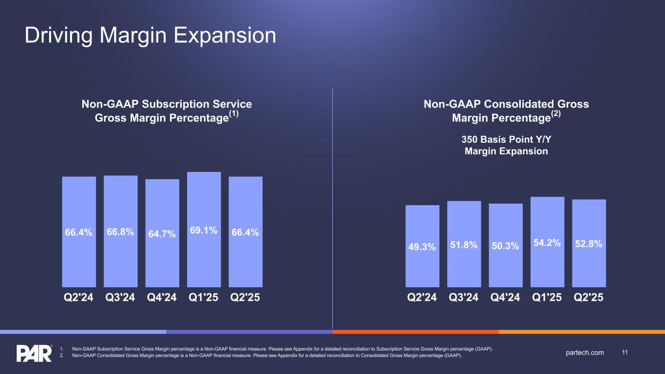 350 Basis Point Y/Y Margin Expansion 1. Non-GAAP Subscription Service Gross Margin percentage is a Non-GAAP financial measure. Please see Appendix for a detailed reconciliation to Subscription Service Gross Margin percentage (GAAP). 2. Non-GAAP Consolidated Gross Margin percentage is a Non-GAAP financial measure. Please see Appendix for a detailed reconciliation to Consolidated Gross Margin percentage (GAAP). 66.4% 66.8% 64.7% 69.1% 66.4% Q2'24 Q3'24 Q4'24 Q1'25 Q2'25 Non-GAAP Subscription Service Gross Margin Percentage(1) Non-GAAP Consolidated Gross Margin Percentage(2) 49.3% 51.8% 50.3% 54.2% 52.8% Q2'24 Q3'24 Q4'24 Q1'25 Q2'25 11partech.com Driving Margin Expansion