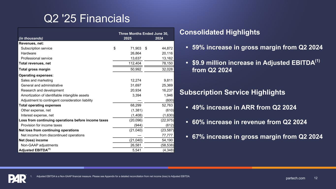 Q2 '25 Financials Consolidated Highlights • 59% increase in gross margin from Q2 2024 • $9.9 million increase in Adjusted EBITDA(1) from Q2 2024 Subscription Service Highlights • 49% increase in ARR from Q2 2024 • 60% increase in revenue from Q2 2024 • 67% increase in gross margin from Q2 2024 Three Months Ended June 30, (in thousands) 2025 2024 Revenues, net: Subscription service $ 71,903 $ 44,872 Hardware 26,864 20,116 Professional service 13,637 13,162 Total revenues, net 112,404 78,150 Total gross margin 50,992 32,028 Operating expenses: Sales and marketing 12,274 9,811 General and administrative 31,697 25,369 Research and development 20,934 16,237 Amortization of identifiable intangible assets 3,394 1,946 Adjustment to contingent consideration liability — (600) Total operating expenses 68,299 52,763 Other expense, net (1,381) (610) Interest expense, net (1,408) (1,630) Loss from continuing operations before income taxes (20,096) (22,975) Provision for income taxes (944) (612) Net loss from continuing operations (21,040) (23,587) Net income from discontinued operations — 77,777 Net (loss) income (21,040) 54,190 Non-GAAP adjustments 26,581 (58,538) Adjusted EBITDA(1) 5,541 (4,348) 12partech.com1. Adjusted EBITDA is a Non-GAAP financial measure. Please see Appendix for a detailed reconciliation from net income (loss) to Adjusted EBITDA.