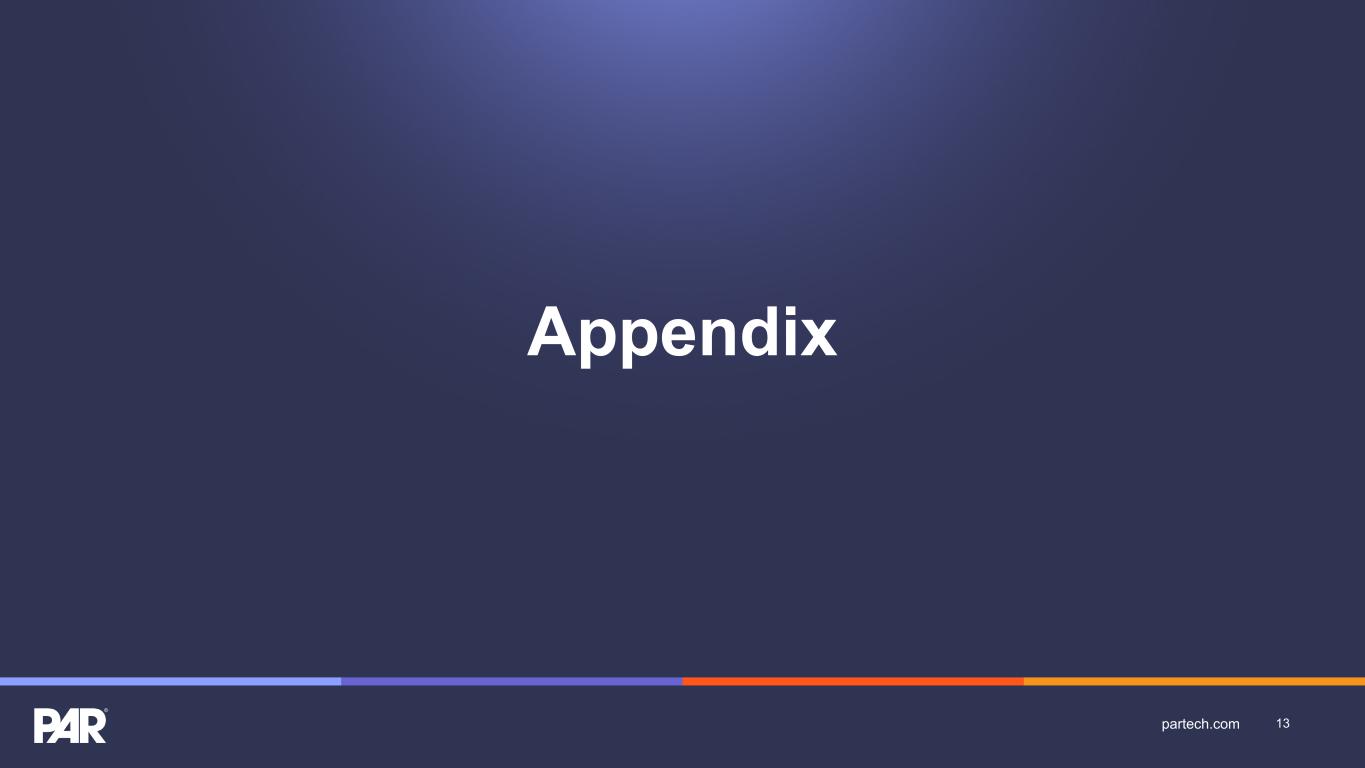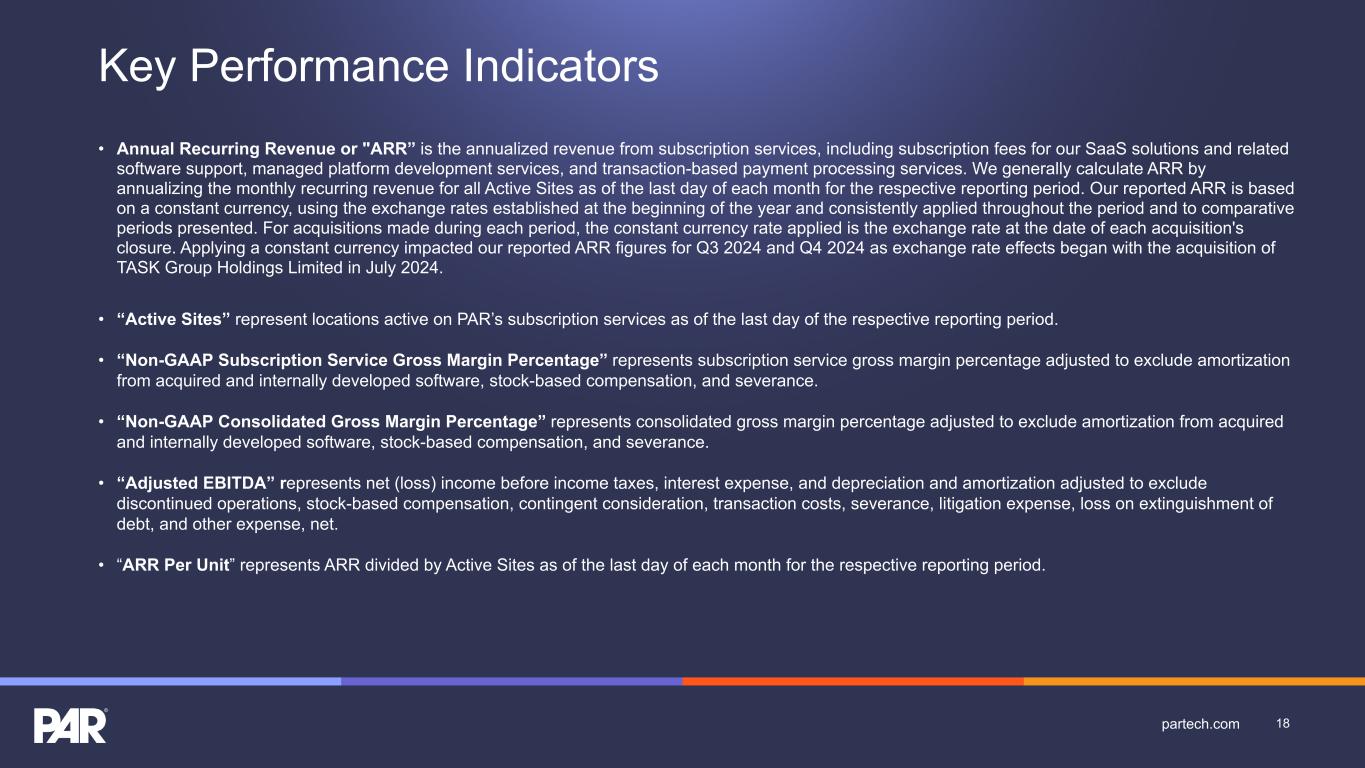 Key Performance Indicators • Annual Recurring Revenue or "ARR” is the annualized revenue from subscription services, including subscription fees for our SaaS solutions and related software support, managed platform development services, and transaction-based payment processing services. We generally calculate ARR by annualizing the monthly recurring revenue for all Active Sites as of the last day of each month for the respective reporting period. Our reported ARR is based on a constant currency, using the exchange rates established at the beginning of the year and consistently applied throughout the period and to comparative periods presented. For acquisitions made during each period, the constant currency rate applied is the exchange rate at the date of each acquisition's closure. Applying a constant currency impacted our reported ARR figures for Q3 2024 and Q4 2024 as exchange rate effects began with the acquisition of TASK Group Holdings Limited in July 2024. • “Active Sites” represent locations active on PAR’s subscription services as of the last day of the respective reporting period. • “Non-GAAP Subscription Service Gross Margin Percentage” represents subscription service gross margin percentage adjusted to exclude amortization from acquired and internally developed software, stock-based compensation, and severance. • “Non-GAAP Consolidated Gross Margin Percentage” represents consolidated gross margin percentage adjusted to exclude amortization from acquired and internally developed software, stock-based compensation, and severance. • “Adjusted EBITDA” represents net (loss) income before income taxes, interest expense, and depreciation and amortization adjusted to exclude discontinued operations, stock-based compensation, contingent consideration, transaction costs, severance, litigation expense, loss on extinguishment of debt, and other expense, net. • “ARR Per Unit” represents ARR divided by Active Sites as of the last day of each month for the respective reporting period. 18partech.com
